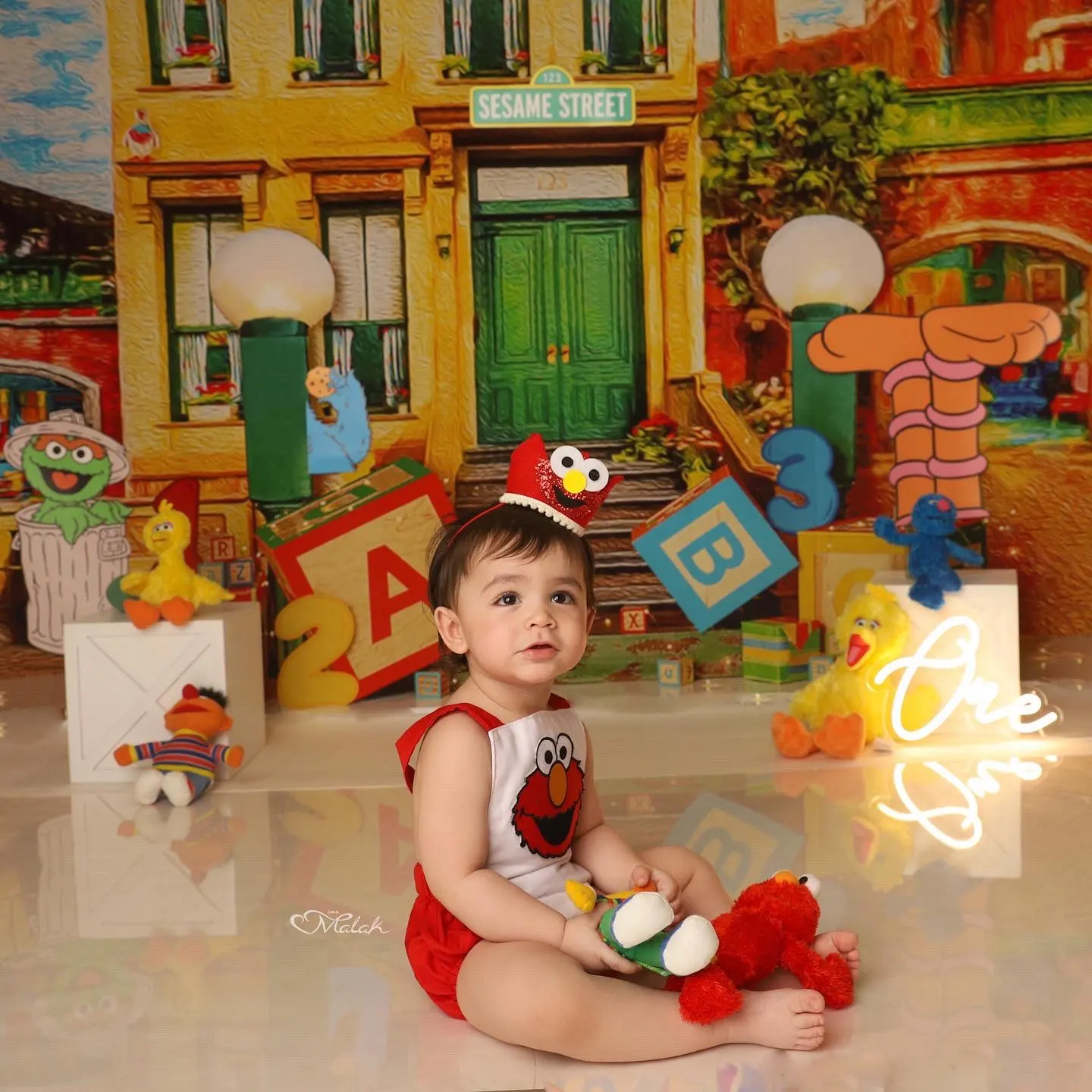 Фон для фотосъемки новорожденных с изображением Улица Сезам на 1-й день рождения