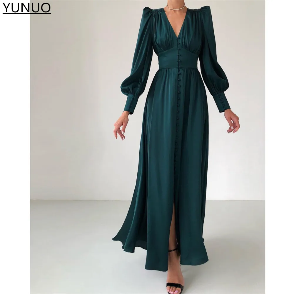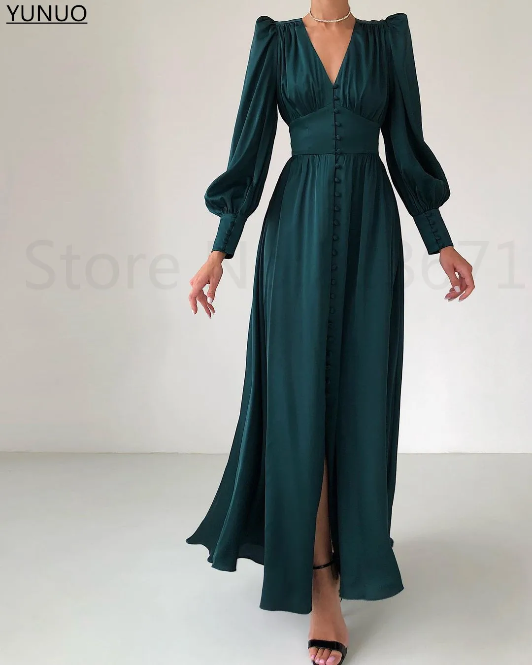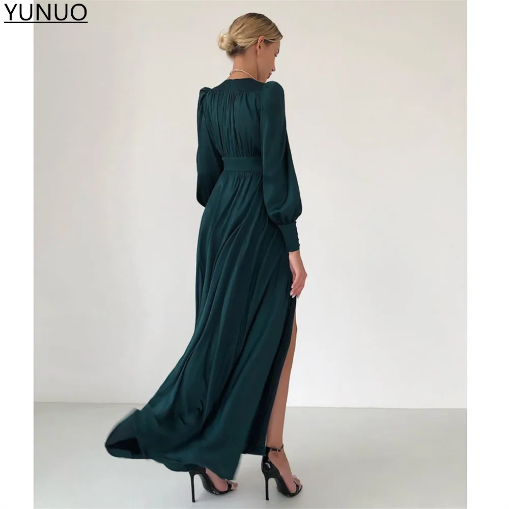 YUNUO темно-зеленое ТРАПЕЦИЕВИДНОЕ платье с длинными рукавами для выпускного вечера платье для свадьбы атласное вечернее платье с разрезом спереди и пуговицами