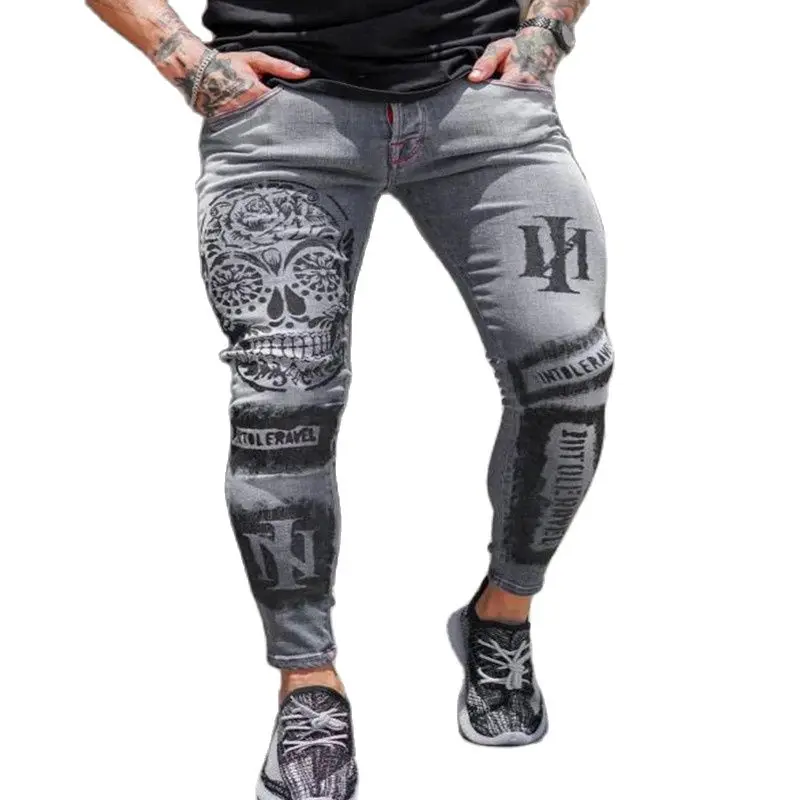 Джинсы мужские стрейчевые, Брендовые брюки с принтом черепа, с надп...