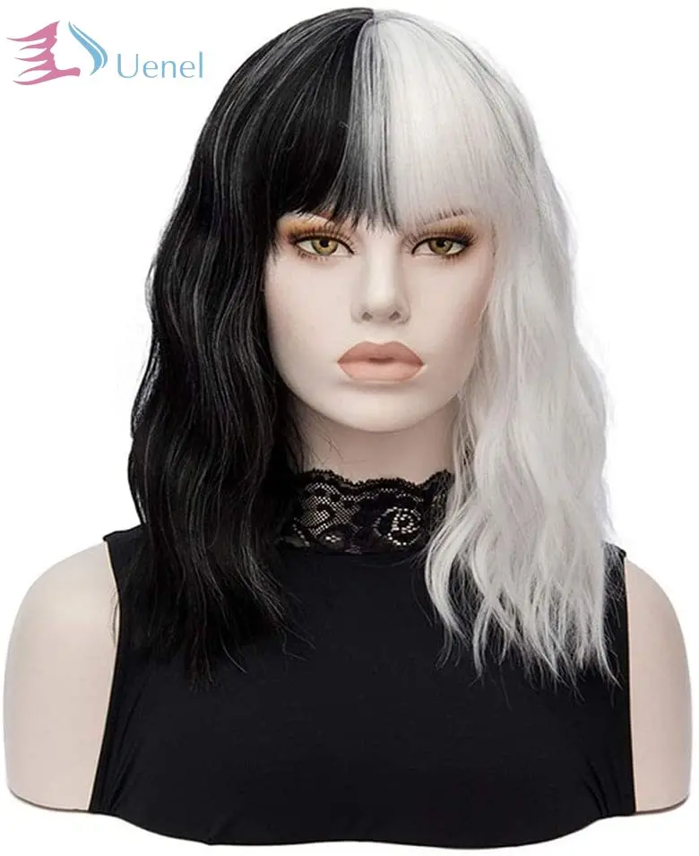 Парик для косплея CRUELLA Deville De Vil, кудрявые наполовину белые...