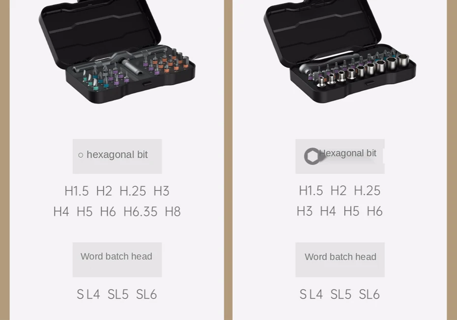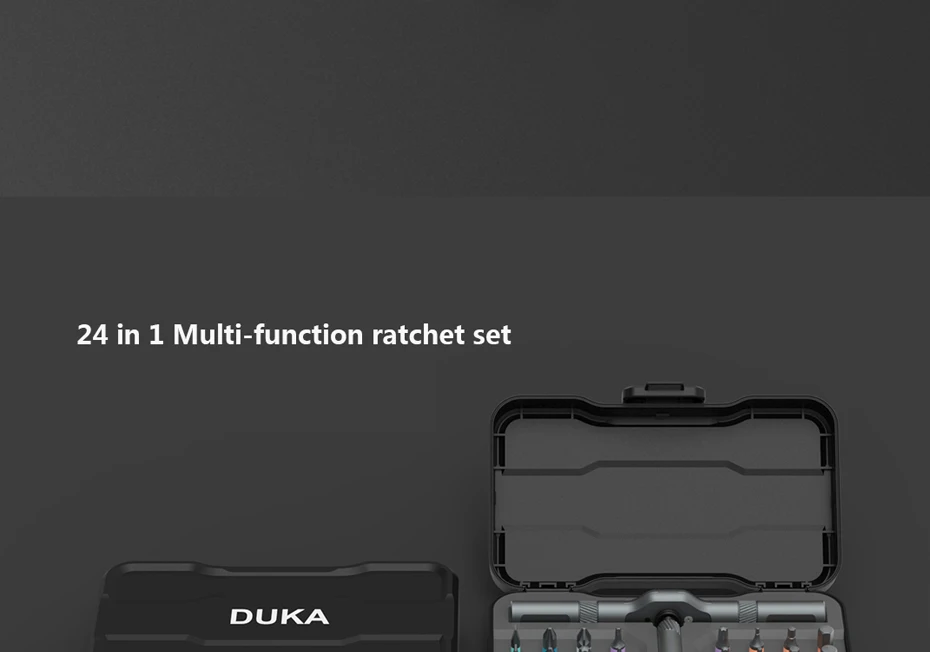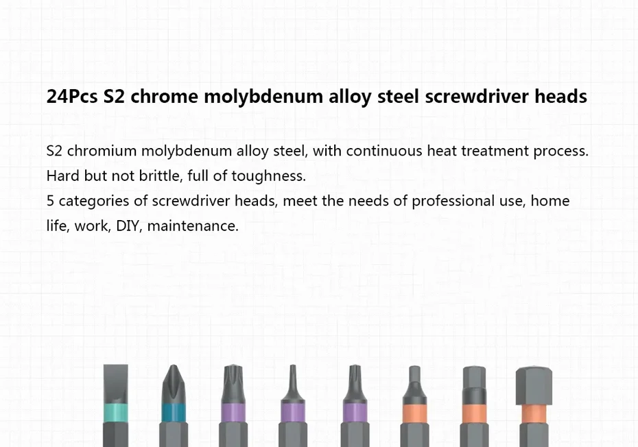 Набор многофункциональных трещоток 24 в 1: Этот набор отверток с трещоткой поставляется с 24 различными насадками для отвертки: щелевые (SL4,SL5,SL6), Phillips (PH1,PH2,PH3), torx (T5, T6, T8, T10, T15, T20, T25,T27), Шестигранник (H1.5,H2,H2.5,H3,H4,H5,H6,H6.35,H8), pozidriv (PZ2). В основном покрывает Общие Характеристики винтов для большинства домашних устройств.