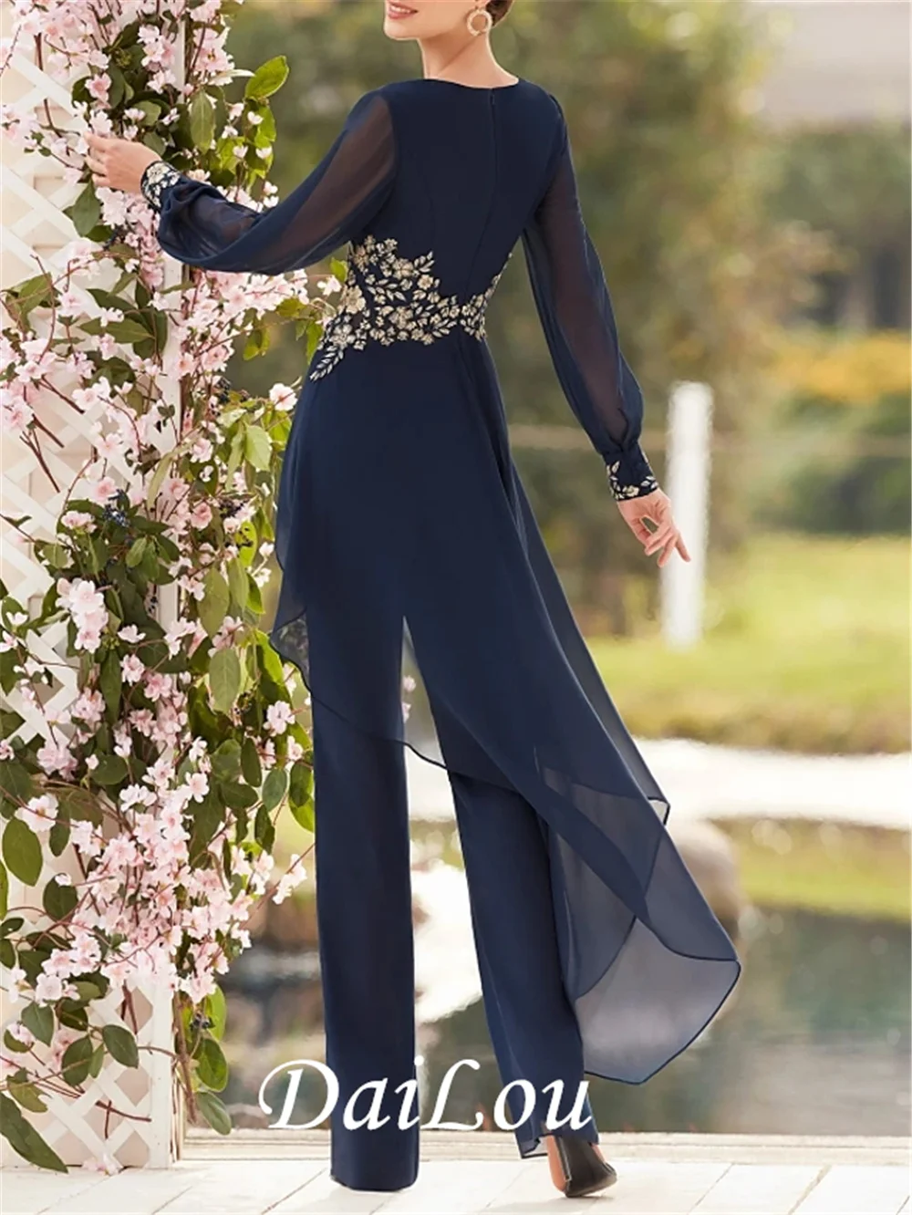 Комбинезон для матери невесты, элегантный шифоновый кружевной комбинезон в пол с V-образным вырезом и длинными рукавами с аппликациями, 2022