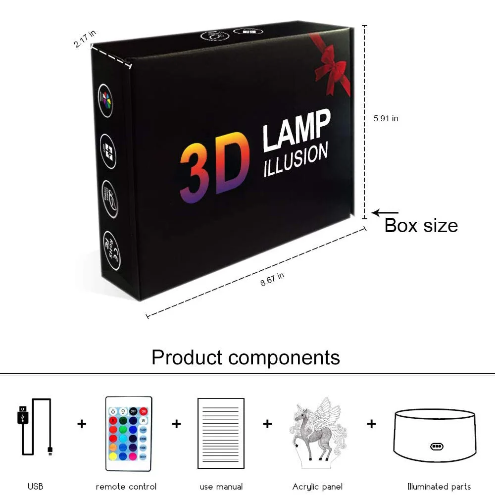 Характеристики:Тип изделия: 3D светодиодный ночной СветильникОсновной Материал: АБС-пластикСветильник Материал направляющей пластины: акрилПроцесс: лазерная гравировкаРежим питания: USB/батарея (батарея не входит в комплект)Входное напряжение: DC5VСветильник источник света: светодиодныйСветильник: 16 цветовСветильник: 3D стереоскопический рисунок (как показано на фотографии)Источник питания: питание от USBРежим переключения: сенсорный выключатель + пульт дистанционного управленияНапряжение продукта: 5 ВМощность продукта: 3 Вт