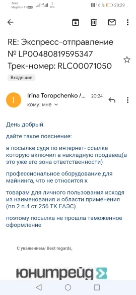 Продавец отправил товар. Но по какой то причине (возможно по его вине в описании), товар попал в перечень товаров ни для личного пользования. Таможня не пропустила товар, я открыл спор, он длился 2 месяца. Алиэкспресс постоянно продливал время спора, мотивируя тем что я сам должен пройти очистку товара и заплатить гос пошлину!! Но это невозможно, согласно Решения СОВЕТА ЕВРАЗИЙСКОЙ КОМИССИИ ОТ 20 ДЕКАБРЯ 2017 N107. Товар предназначенный не для личного пользования может декларировать и оплачивать за него пошлины и тд.только юридическое лицо!!! Я не являюсь юридическим лицом. Алиэкспресс неправильно трактовал решение таможни., а продавец отказал в возврате денег, хотя товар обратно вернётся к нему, но я уже этого не узнаю, это не отслеживается. В итоге я без денег и без товара!