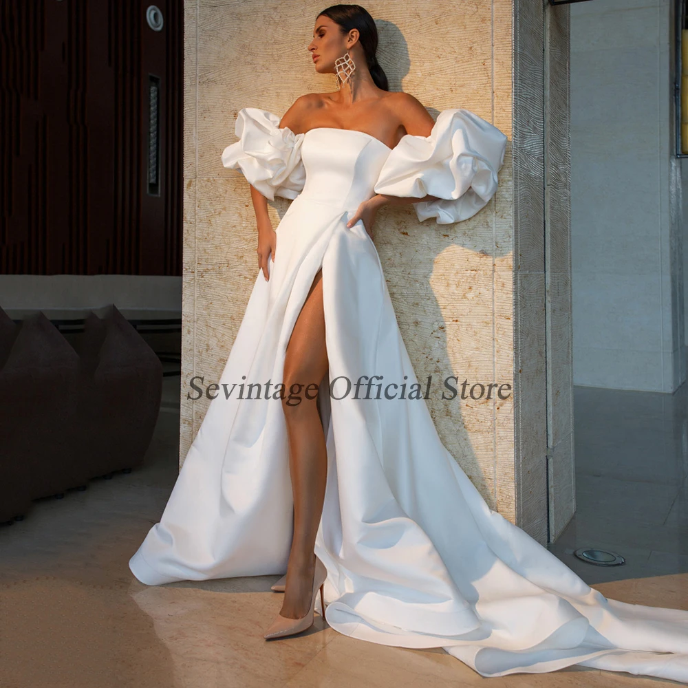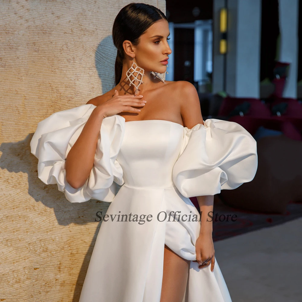 Платье невесты Sevintage, с высоким вырезом сбоку, с пышными рукавами, ТРАПЕЦИЕВИДНОЕ, без бретелек, 2021