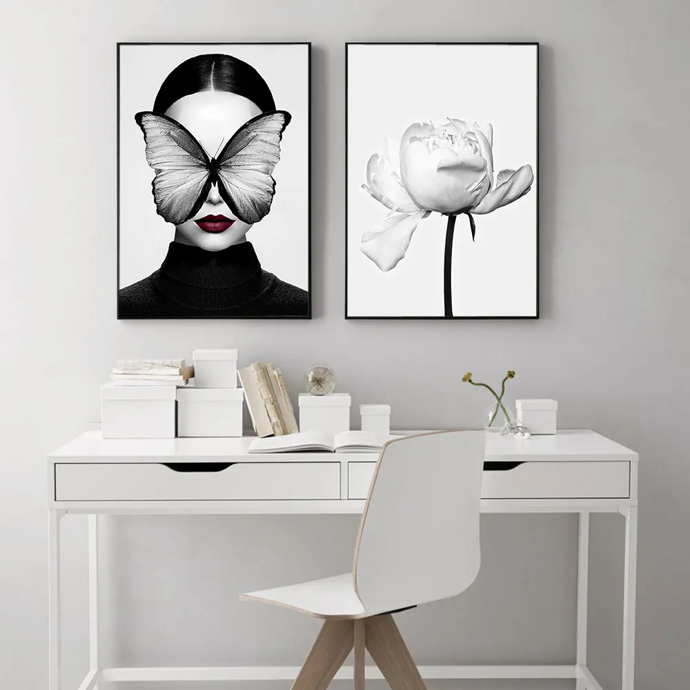 Постер в скандинавском стиле, модная холщовая картина с маской-бабочкой и белыми цветами розы, Художественная печать, Настенная картина, декор для гостиной и дома