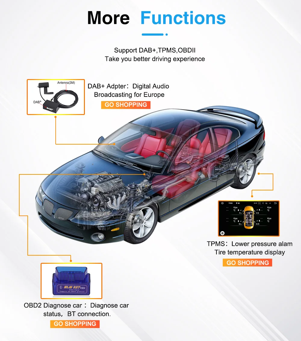 supportWIFI.OBD2 .DVR DAB+ TMPS rear view camera Bluetooth