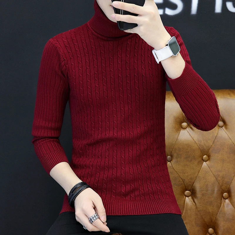 Повседневный мужской осенне-зимний однотонный вязаный облегающий свитер с длинным рукавом и высоким воротником мужской пуловер трикотажная одежда