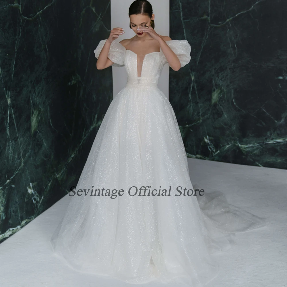 Платье Свадебное блестящее ТРАПЕЦИЕВИДНОЕ из тюля с пышными рукавами и V-образным вырезом