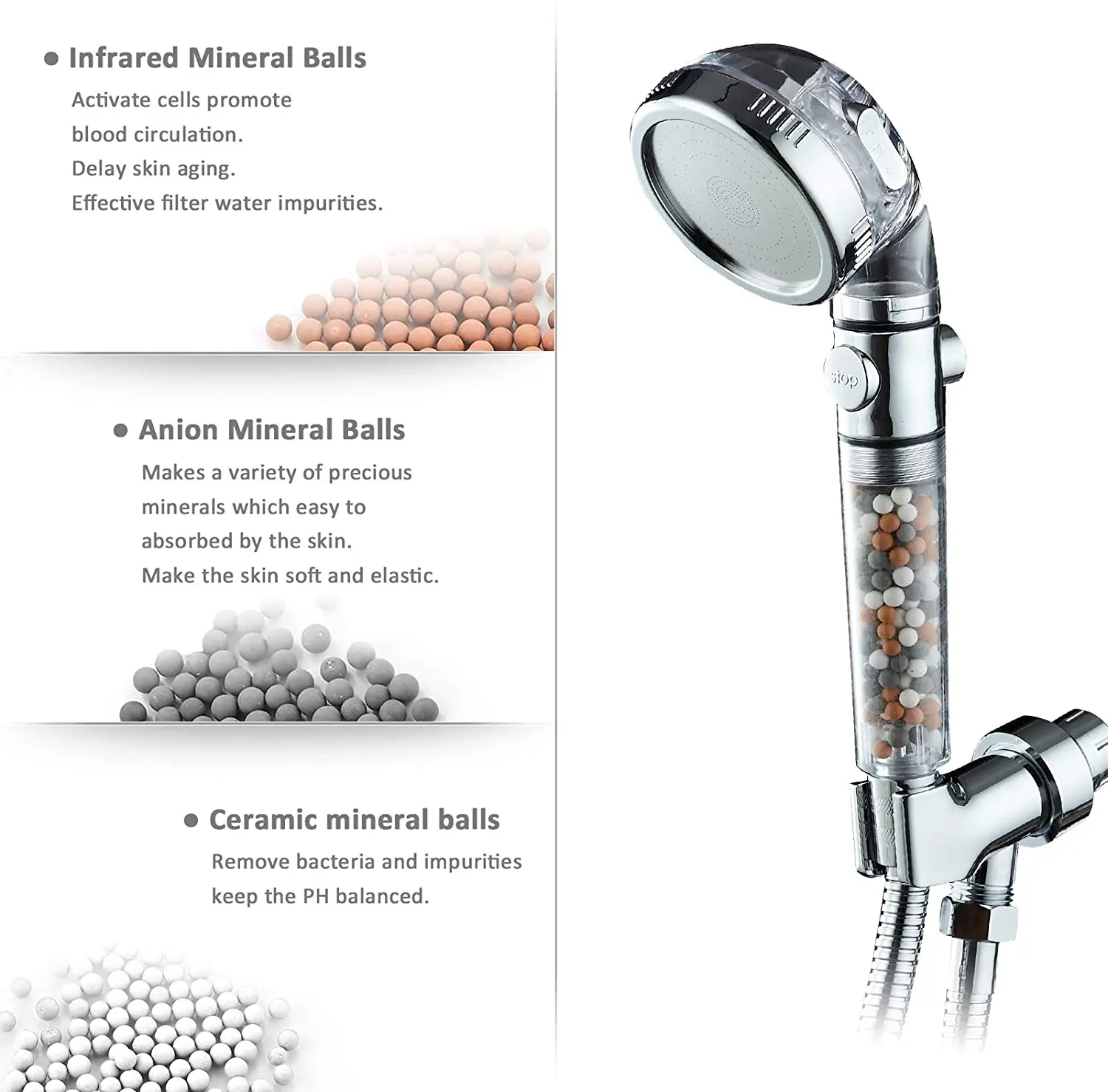 Характеристика:-Кнопка остановки: кнопка включения/выключения, легко Управляйте водой для душа.-- 3 режима распыления: осадки/массаж/струя-Система фильтрации: шарики фильтра Эффективно удаляют загрязнения в воде, хорошо подходят для кожи и волос.-- Разобранная конструкция: она удобна для ежедневной уборки.-- Конструкция высокого давления: революционная технология микросопла делает отверстия на выходе меньше и плотнее, увеличивая скорость потока воды, тем самым увеличивая давление воды.-Широкое использование: подходит для детей, взрослых, инвалидов, кемперов, домашних животных, щенков.