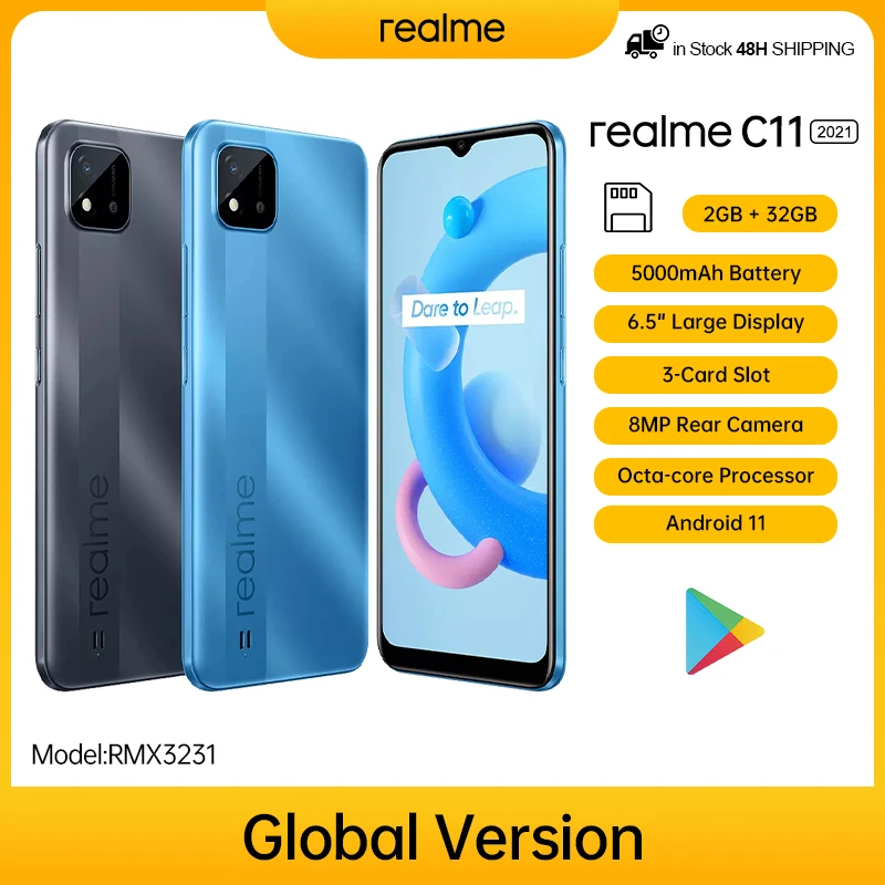 Глобальная версия realme C11 Мобильный телефон 2 ГБ 32 ГБ Helio G35 5000 мАч аккумулятор 6,5 дюймов полноэкранный 13 МП Двойная камера 3 слота для карт