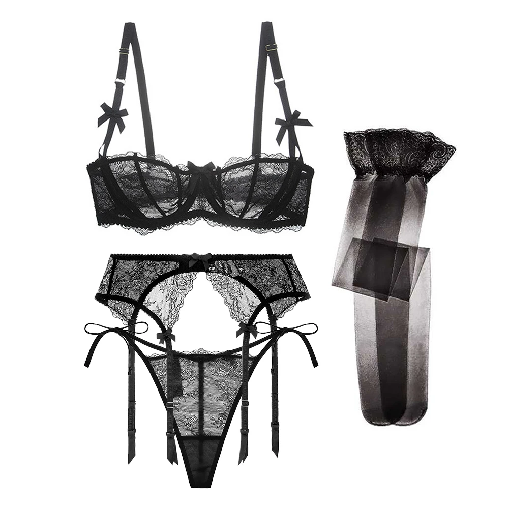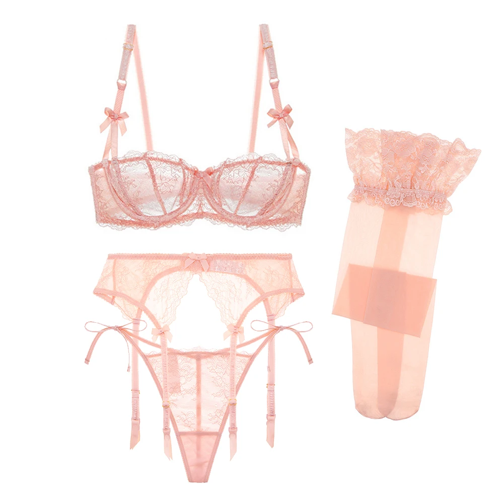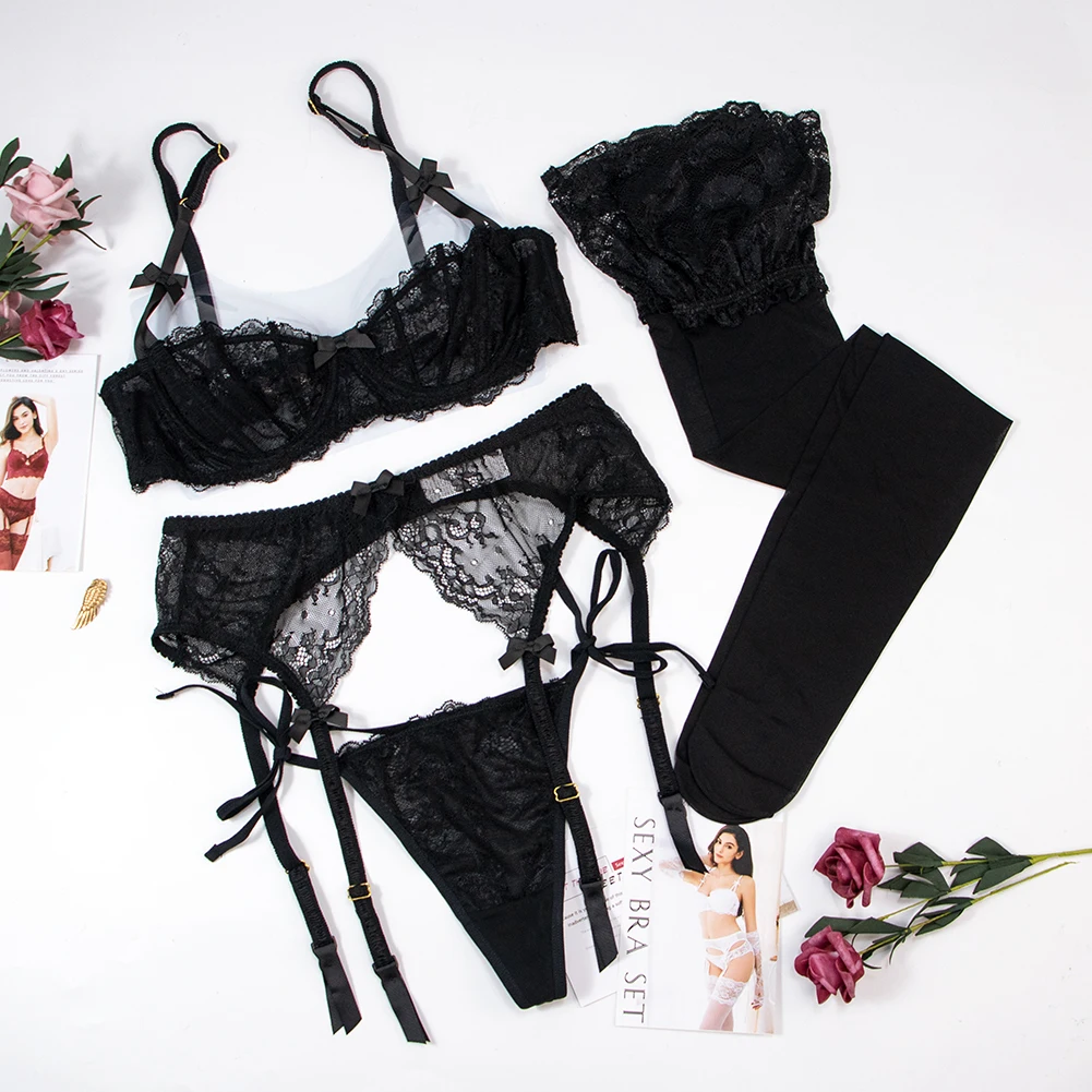 Сексуальный кружевной дышащий бюстгальтер с получашкой, тонкий пояс, стринги с цветком, прозрачные бюстгальтер набор нижнего белья + подвязки + стринги + чулки, 4 шт.компл.