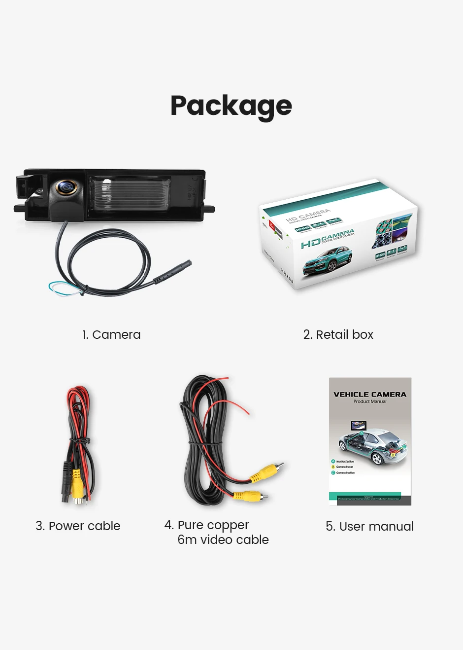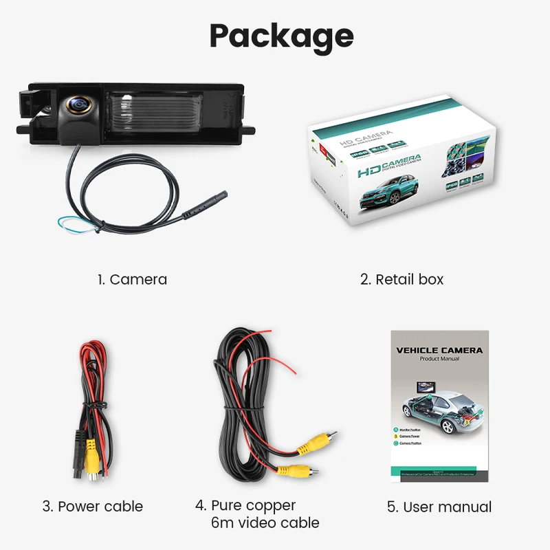 1. Камера заднего вида2. Розничная коробка3. Кабель питания4. Чистый медный 6 м видео кабель5. Руководство пользователя