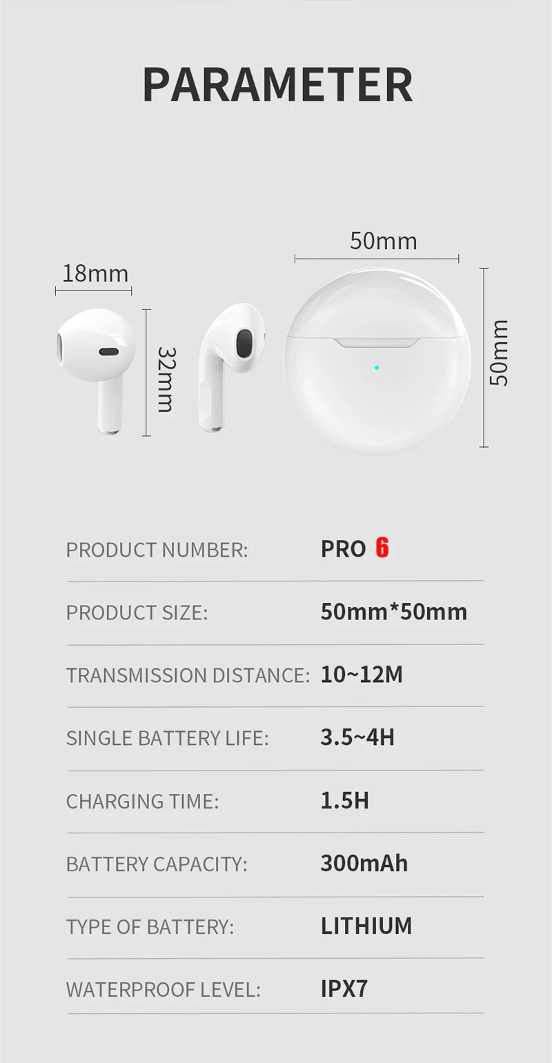 Bluetooth-наушники Air Pro 6 TWS, Hi-Fi стерео, Bluetooth 5,0