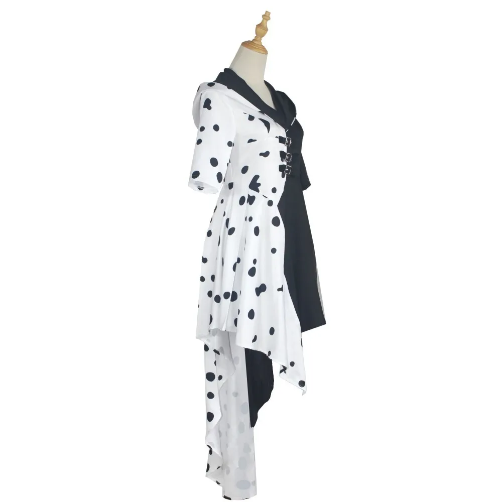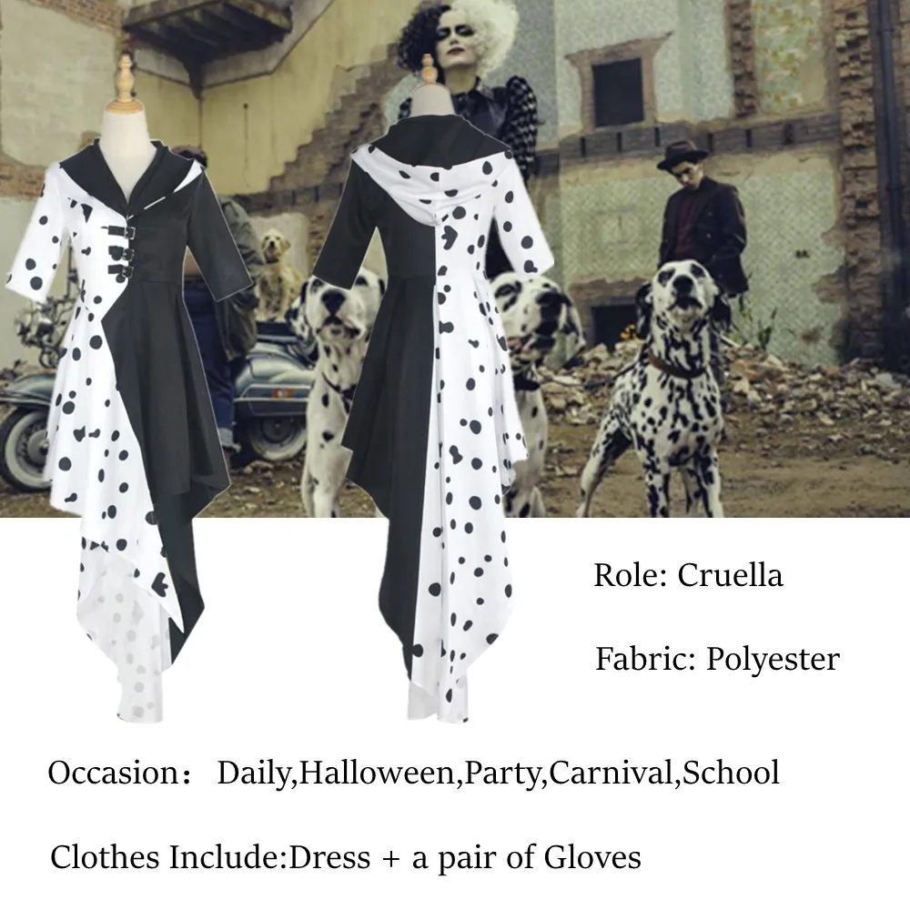 Косплей-костюм из фильма Cruella De Vil, женские пятнистые черные белые платья, перчатки, парик, аниме 101, далматинцы, вечерние НКА на Хэллоуин