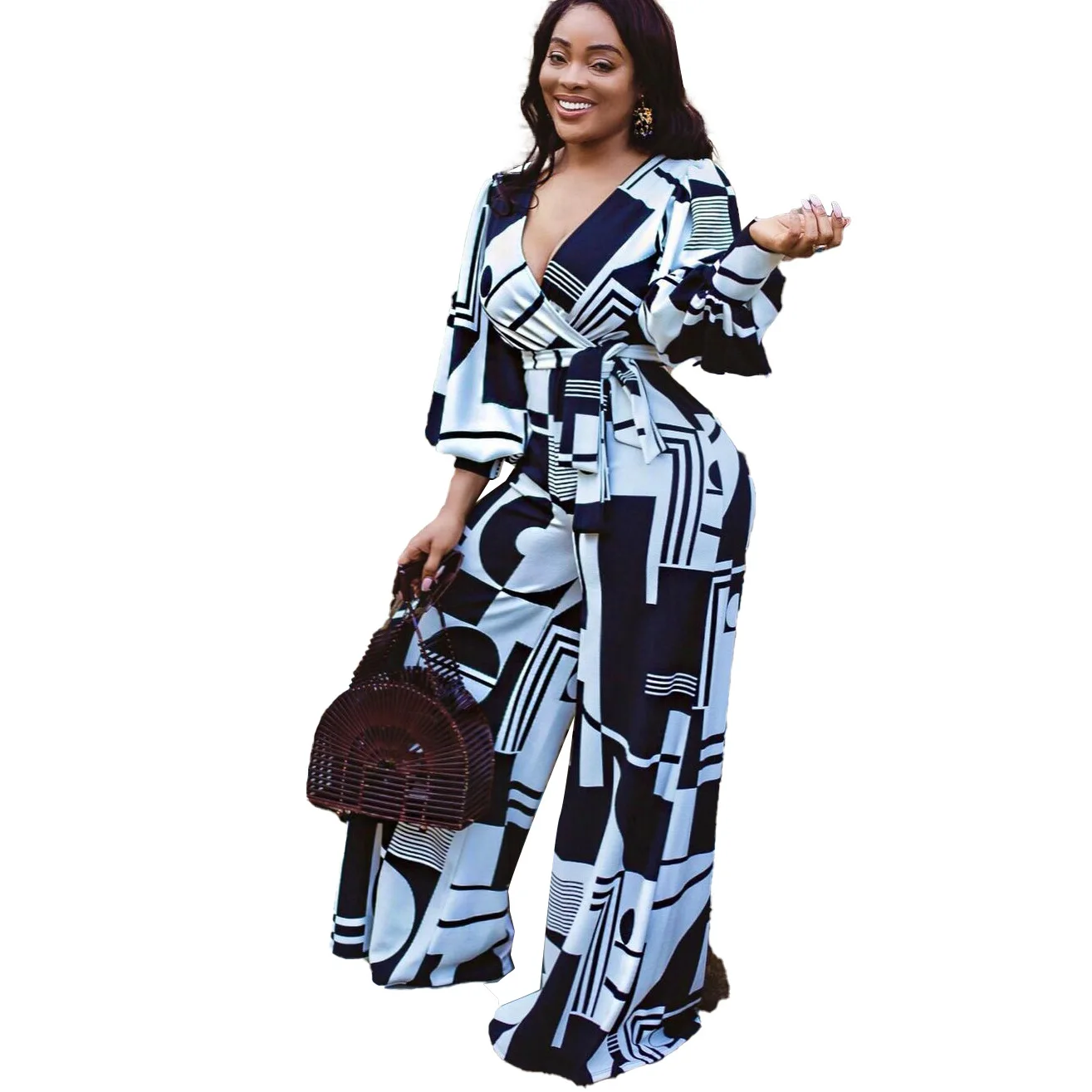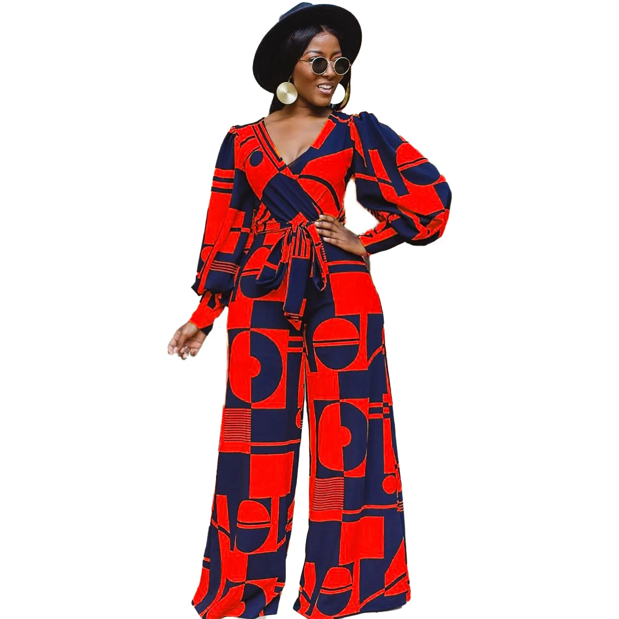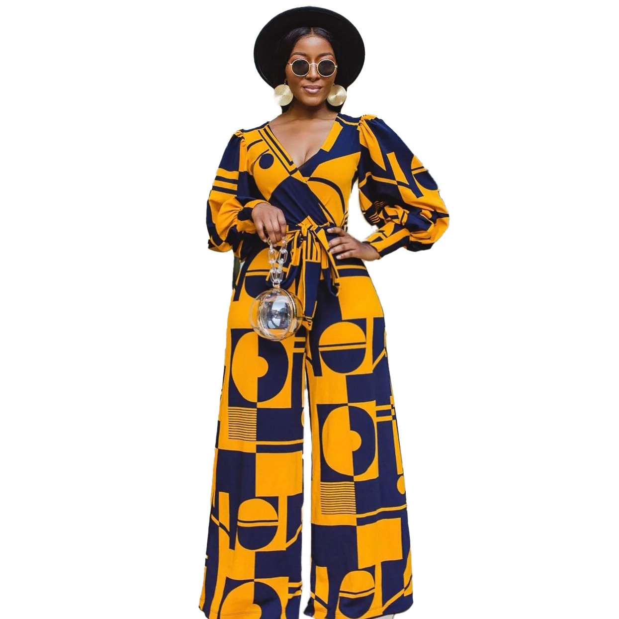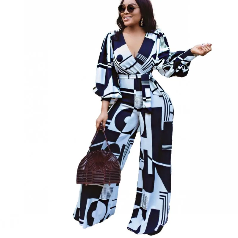 Женский комбинезон Дашики, синий комбинезон с широкими штанинами, с V-образным вырезом, в африканском стиле