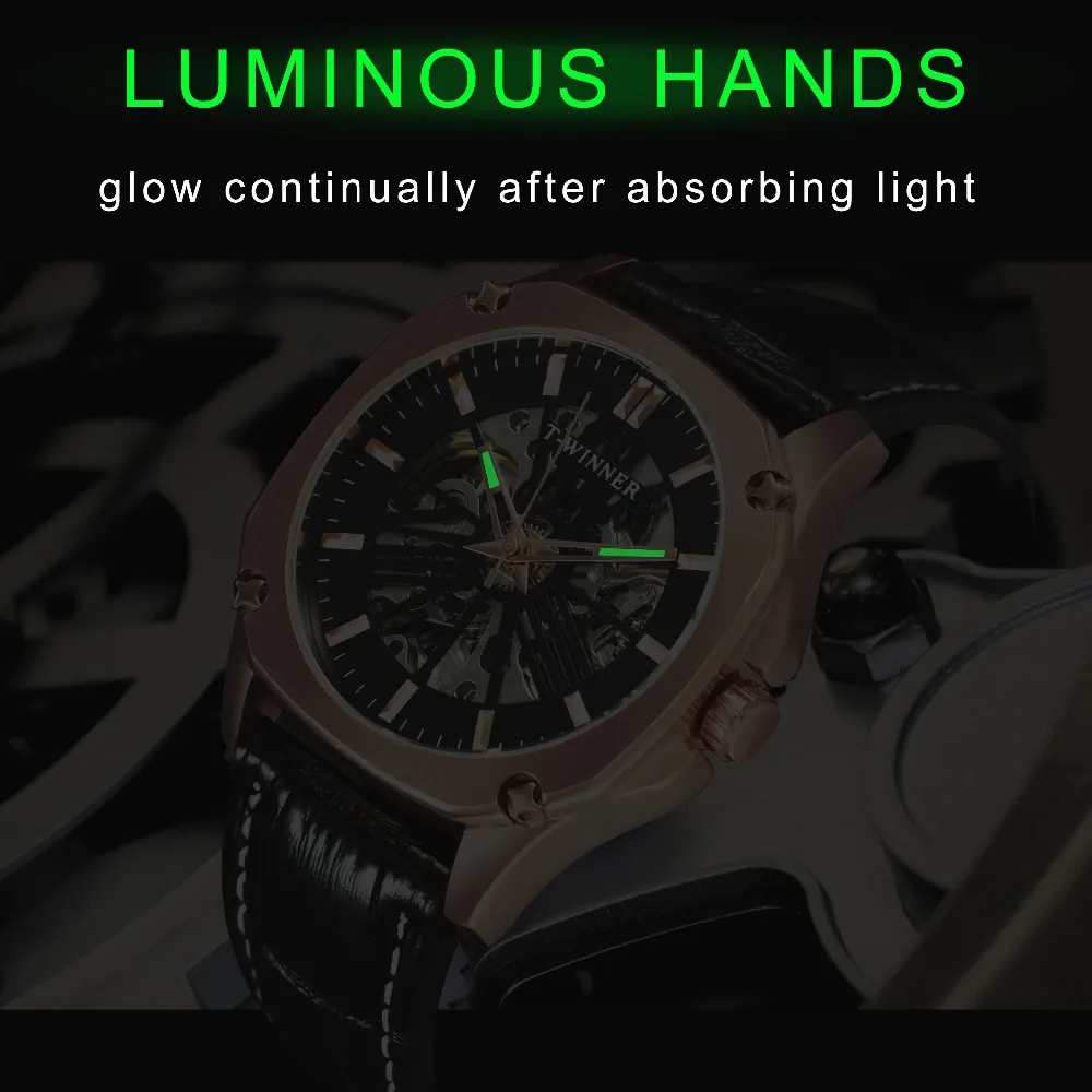 Функция подсветки: указатели этих автоматических механических часов имеют светящийся эффект, чтобы гарантировать, что владельцы могут четко видеть время ночью.