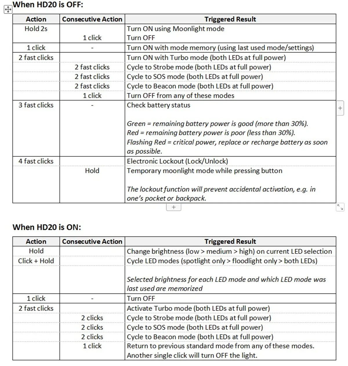Светодиодный индикатор в боковом выключателе показывает состояние питания в течение 5 секунд после включения HD20.♣Зеленый = оставшаяся мощность батареи Хорошая (более 30%).♣Красный = оставшаяся мощность батареи плохая (менее 30%).♣Мигающий красный = критическая мощность, замена или перезарядка аккумулятора как можно скорее.Низкая Напряжение защиты: если батареи Напряжение ниже, чем 2,7 V, HD20 отключается автоматически, чтобы избежать повреждения батареи от переразряда.