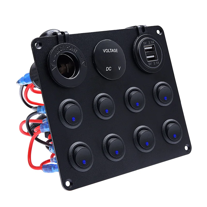 Набор многофункциональных панелей; Двойное зарядное устройство USB: 5 В постоянного тока/2,1 А и 2,1 А; Выходная мощность: 12 В постоянного тока; Диапазон отображения вольтметра: 6 - 30 в; 8 переключателей: 12 В постоянного тока 20А.