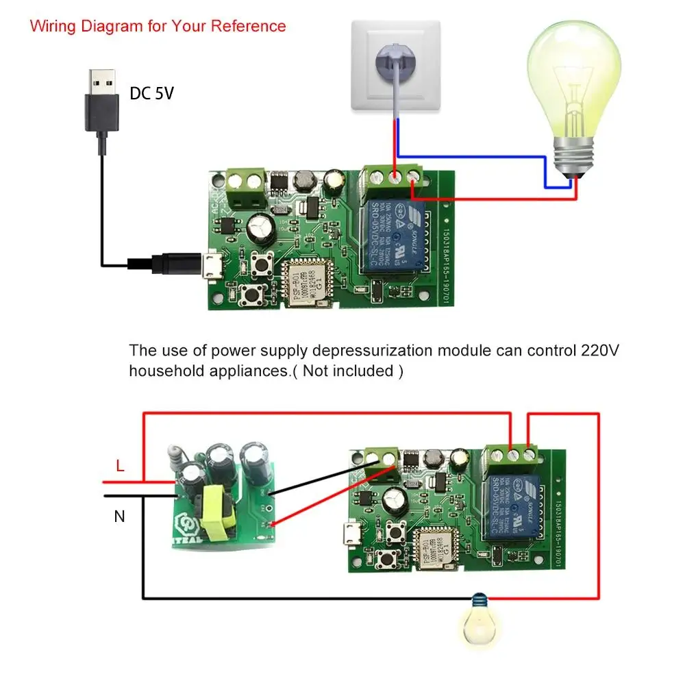 Option1.Ewelink app DC7-32V USB5VOption2.Tuya smart life app DC7-32V USB5V (есть подробные инструкции в посылка) Светильник с инструкцией по сигналу и релеМощность <1 Вт и Ток покоя: 80 мАCutover ток <10A , Cutover напряжение <25010А релейный режимСрок службы реле модели составляет более 1000, 00Сопротивление изоляции: 100Максимальное время натяжения: 15 мМаксимальное время выпуска: 5 мРабочая температура: от-40 до 70 градусовРабочая влажность: от 40% до 80% относительной влажностиФункция инширования по умолчанию: нажмите на открытое реле на мобильный телефон, Затем отрежьте натяжение автоматически (по умолчанию одна секунда), он имеет функцию синхронизации одновременно.Самоблокирующийся при нажатии кнопки «инчинг» и «запирающий» светильник. Нажмите открыть реле для включения, Нажмите закрыть реле для отключения.