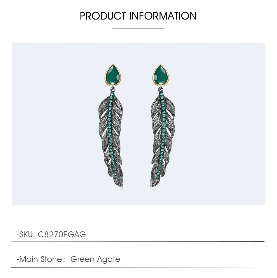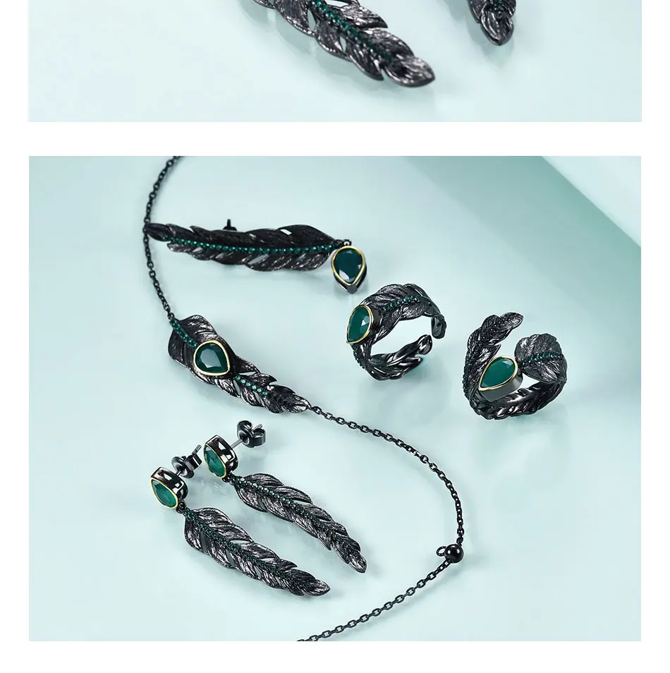 Женское кольцо из серебра 2021 пробы с зеленым агатом и перьями