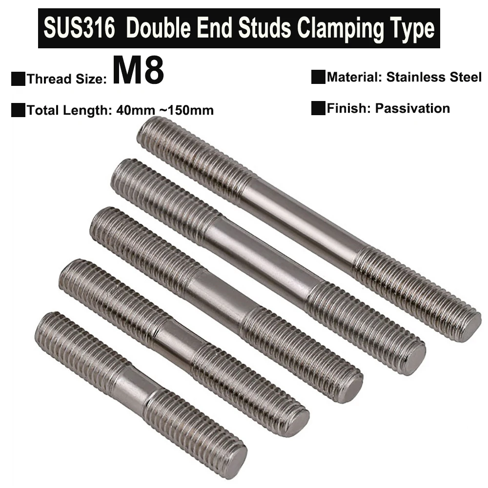 2 шт./1 шт. M8 SUS316 двухконцевые шпильки из нержавеющей стали зажимного типа Безголовый болт шпилька зубная палка двойная головка Резьбовая планка Общая длина: 40 мм ~ 150 мм