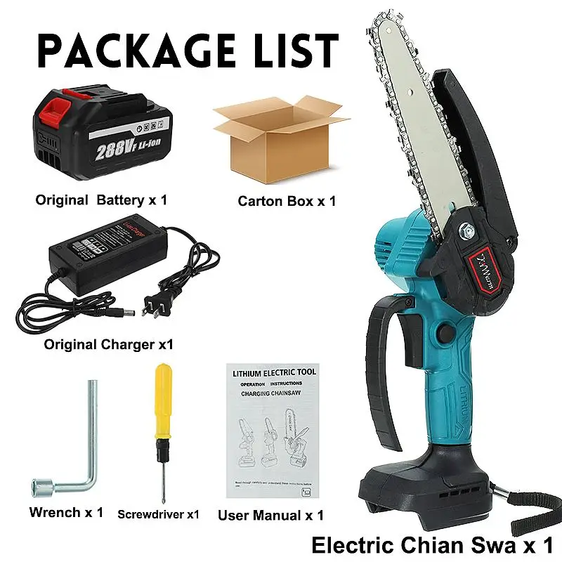 -Мощность: 3000 Вт-Напряжение: 288 в-Цепное колесо: 1/6"-Размер: 22х17 см-Адаптер питания: вилка стандарта ЕС/США-Применимые варианты: садовый сад/бамбуковая Резка/обрезка/резка дровХарактеристика:-Литиевая батарея большой емкости. Технология литиевой батареи, защита от перегрузки батареи, быстрая зарядка.-Двигатель с медным сердечником. Сильная мощность, быстро собирает энергию, выводит сильную мощность.-Высококачественная направляющая цепь. Острая и износостойкая, глубокая закалка более износостойкая и гладкая резка.-Эргономичная ручка, которая очень удобна и безопасна для переноски.-Ручка имеет противоскользящий дизайн, который очень удобен для захвата.-Безопасность пилы, эффективно повышает эффективность вашей работы.-Бесступенчатая скорость, более детальная обрезка, лучшая защита деревьев.Примечание:1. Допускается погрешность в 1-3 см из-за ручного измерения. Перед размещением заказа, пожалуйста, внимательно ознакомитесь со всеми условиями.2. Цвета могут отличаться, так как на дисплее разница, пожалуйста, поймите.