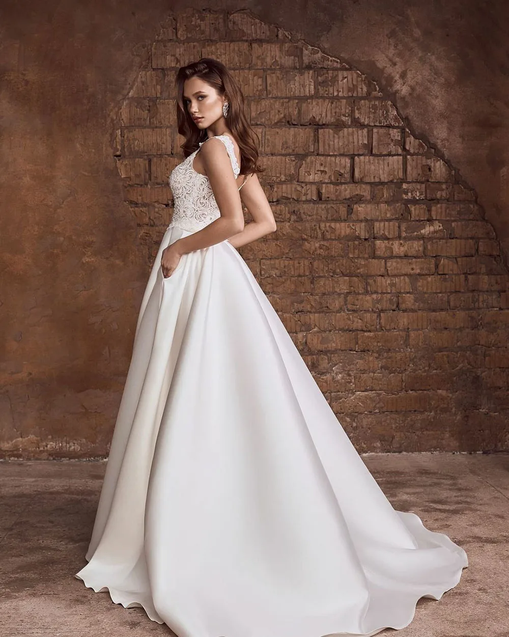 Платье свадебное атласное с V-образным вырезом и рукавами-крылышками