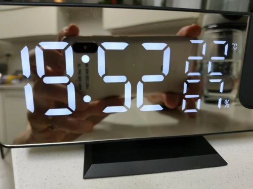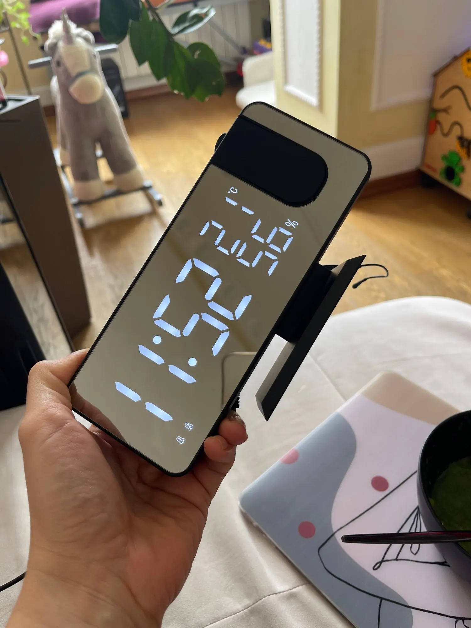 【 7,3 "большой светодиодный дисплей и зеркальный экран 】Будильник достаточно большой, вы можете четко видеть время с другой стороны комнаты даже для близоруких или пожилых людей. И этот экран не только имеет продвинутый внешний вид, но и может использоваться как зеркало. Красивый и практичный.