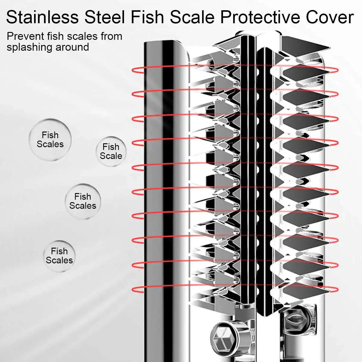 -Защитная крышка из нержавеющей стали предотвращает брызги рыбы и защищает руки от травм лезвия.