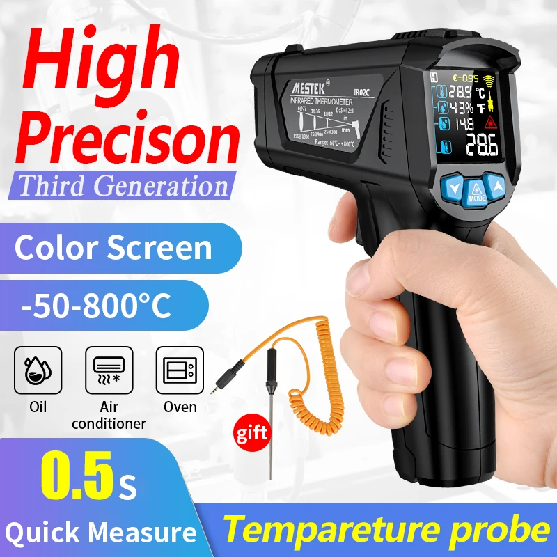 Цифровой инфракрасный термометр MESTEK, лазерный Бесконтактный измеритель температуры и влажности с цветным ЖК-дисплеем и сигнализацией