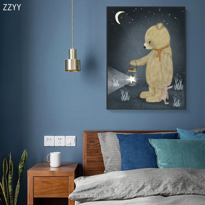 Современный милый медведь с лампой для освещения, мультяшное искусство, холст, фотообои для детской комнаты, украшение для дома
