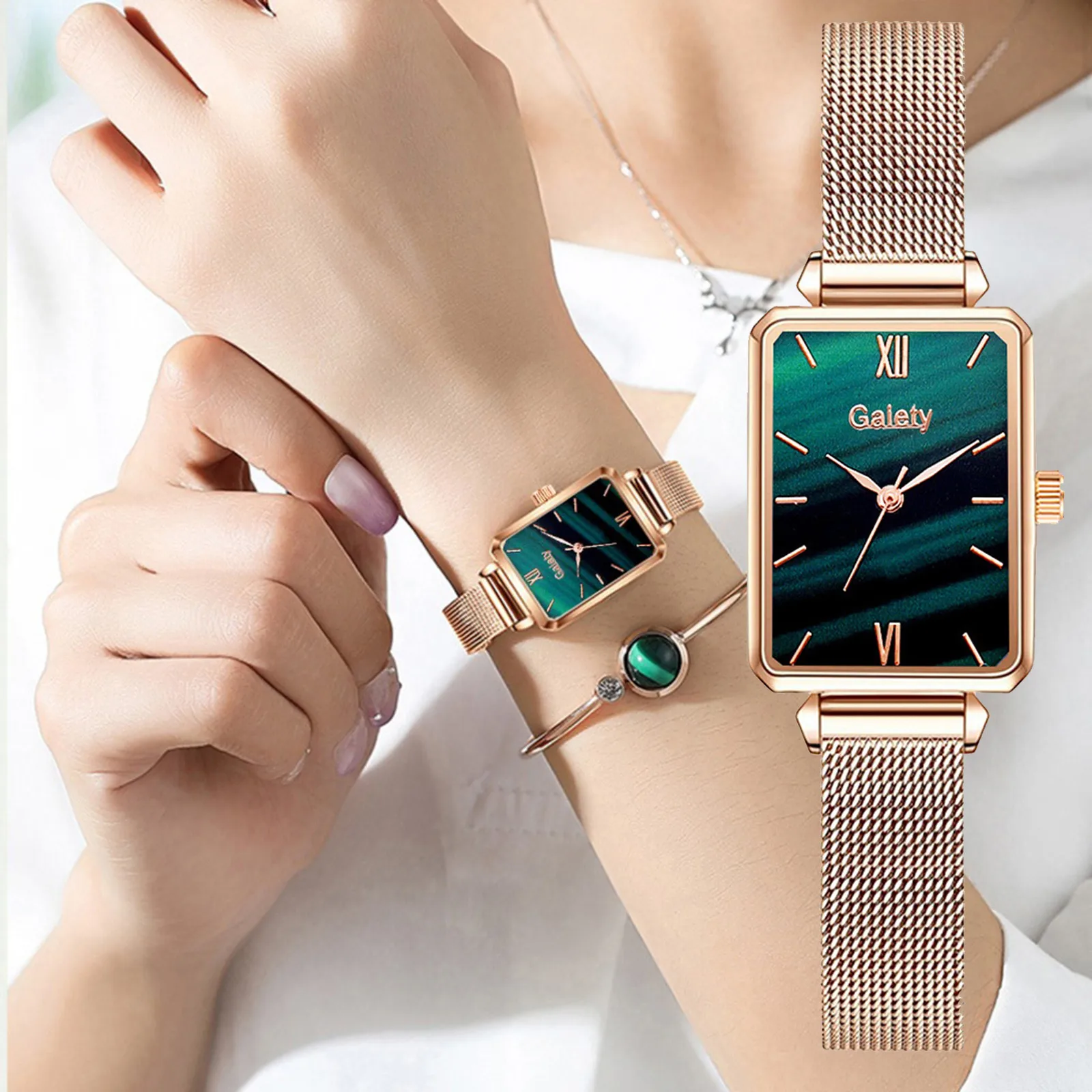 Женская мода Кварцевые часы браслет набор зеленый циферблат роскошные женские часы Простой розовое золото сетка Женские часы
