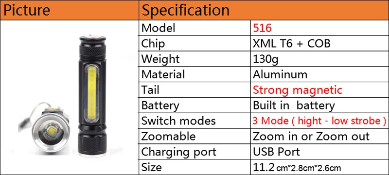 1. Название бренда: Litwod2. Название модели: 516& 0173. Светодиодный излучатель:XM-L T6 + COB4.Режим: 3 режима (COB high - COB low - T6 high)