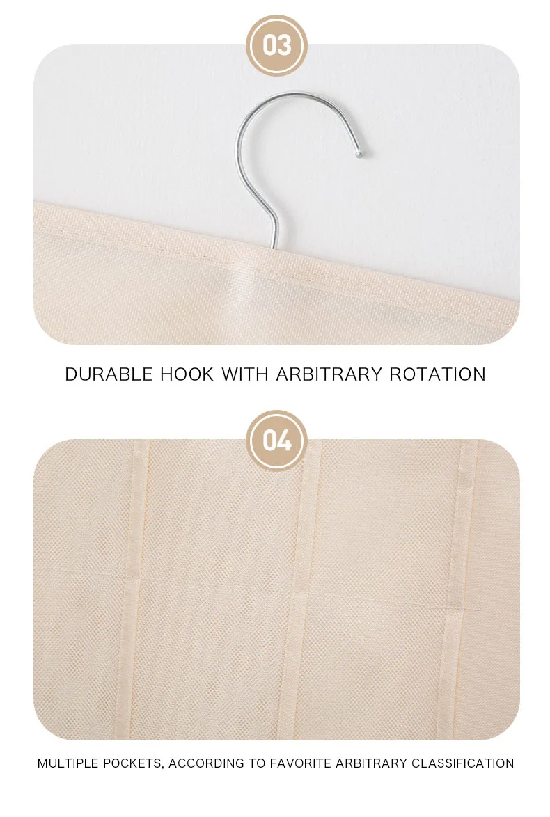 1. ДвустороннийОбновленные модели и двухсторонний дизайн, разные размеры карманов могут быть разделены на хранение, аккуратные и аккуратные, полностью использовать пространство спереди и сзади.Вращающийся на 2,360 градусов крюкСверхмощный и крепкий крючок, висящий в двери, шкафу, спальне и т. д. Вешалка легко снимается, а мешок для хранения можно свернуть или сложить.3. Универсальный держательИдеально подходит для хранения нижнего белья, носков, браслетов, косметики, волос и модных аксессуаров и всевозможных электронных устройств. Держите аксессуары аккуратными и организованными.4. Прозрачные сетчатые карманыПрозрачные окна с обеих сторон позволяют быстро идентифицировать содержимое, так что вы можете готовиться или убирать вещи с меньшим усилием.