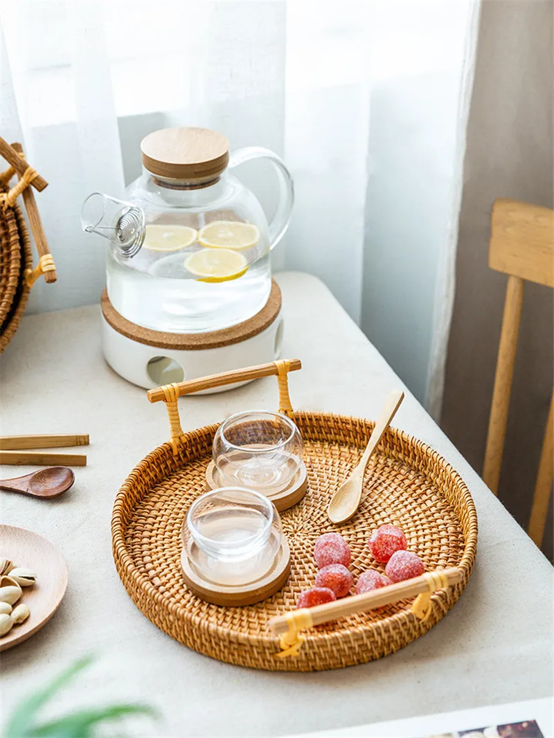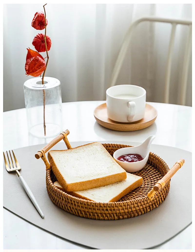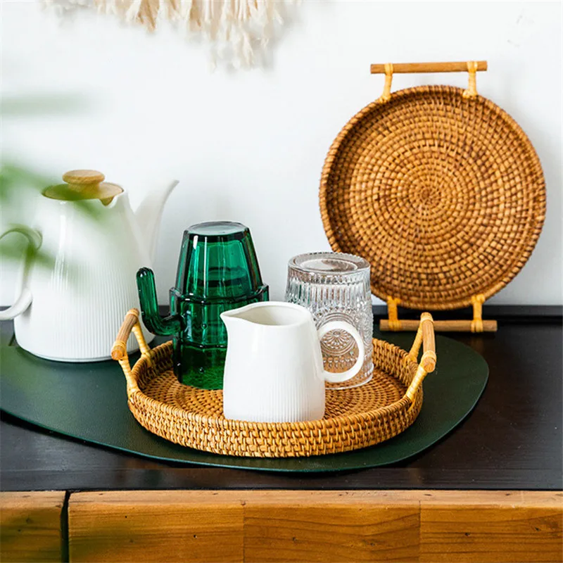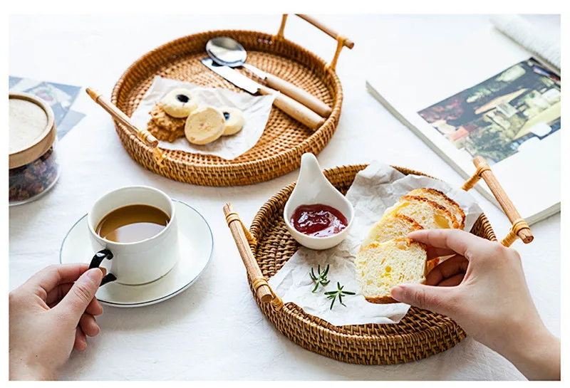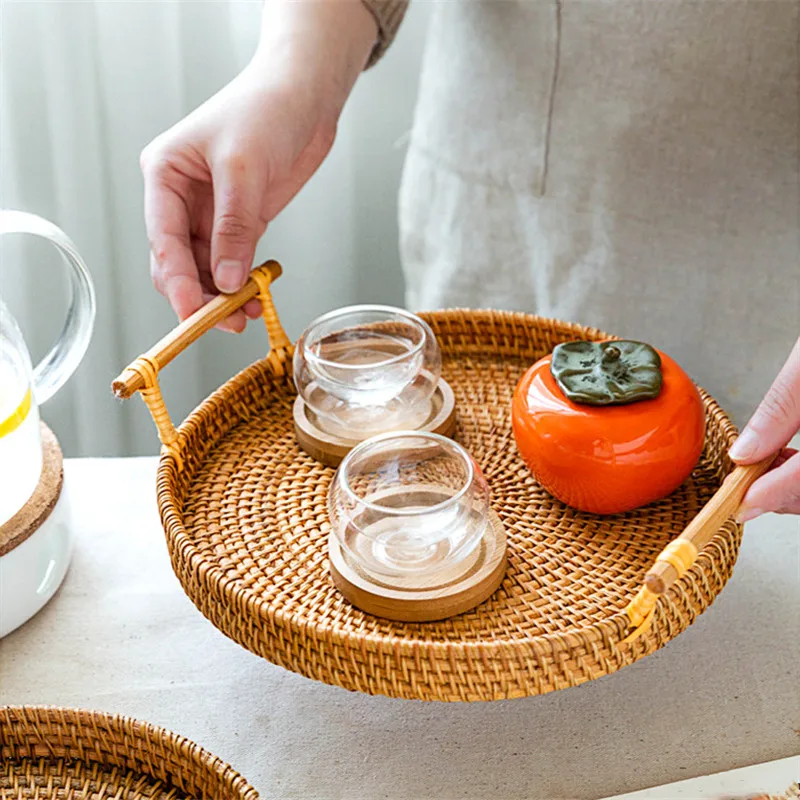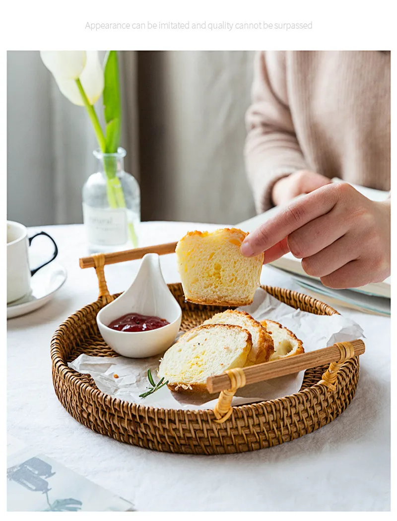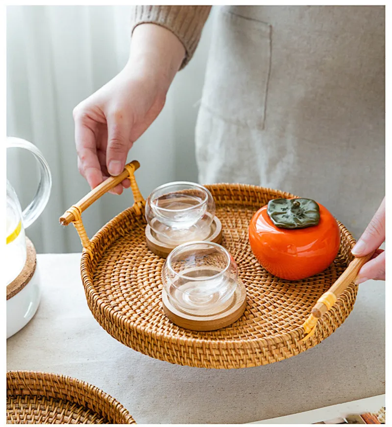 Лоток для хранения из ротанга, круглая плетеная корзина ручной работы с ручкой, ротанговый сервировочный лоток, плетеная корзина для хлеба, фруктов, еды, завтрака, дисплей-ручной фруктовый хлеб, закуска, лоток, круглая плетеная корзина, подносы для хранения, ручная работа, японский чайный поднос, чайный поднос, декоративный поднос