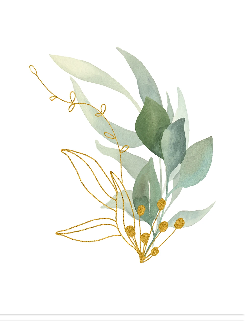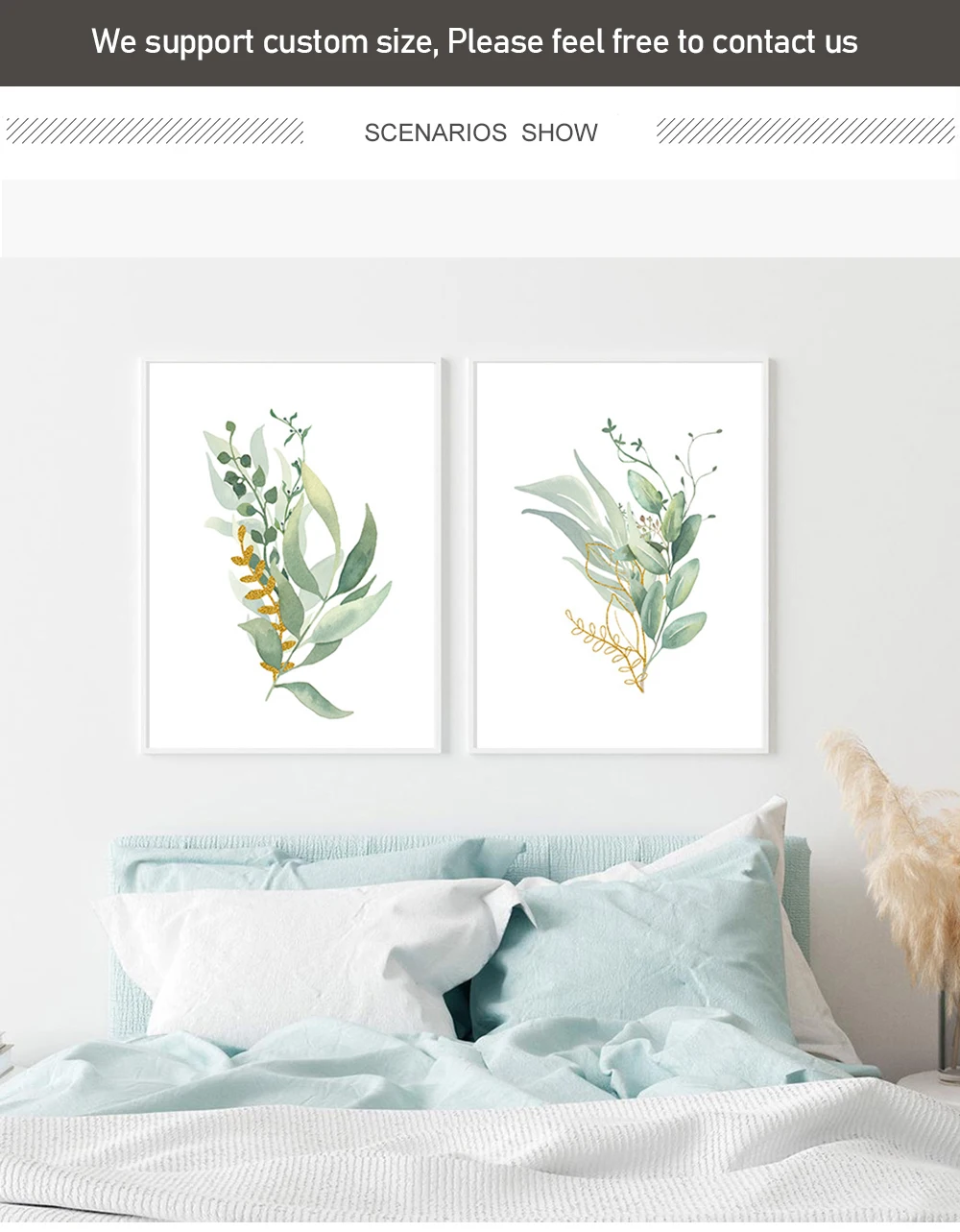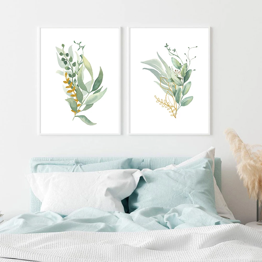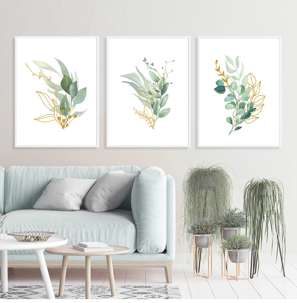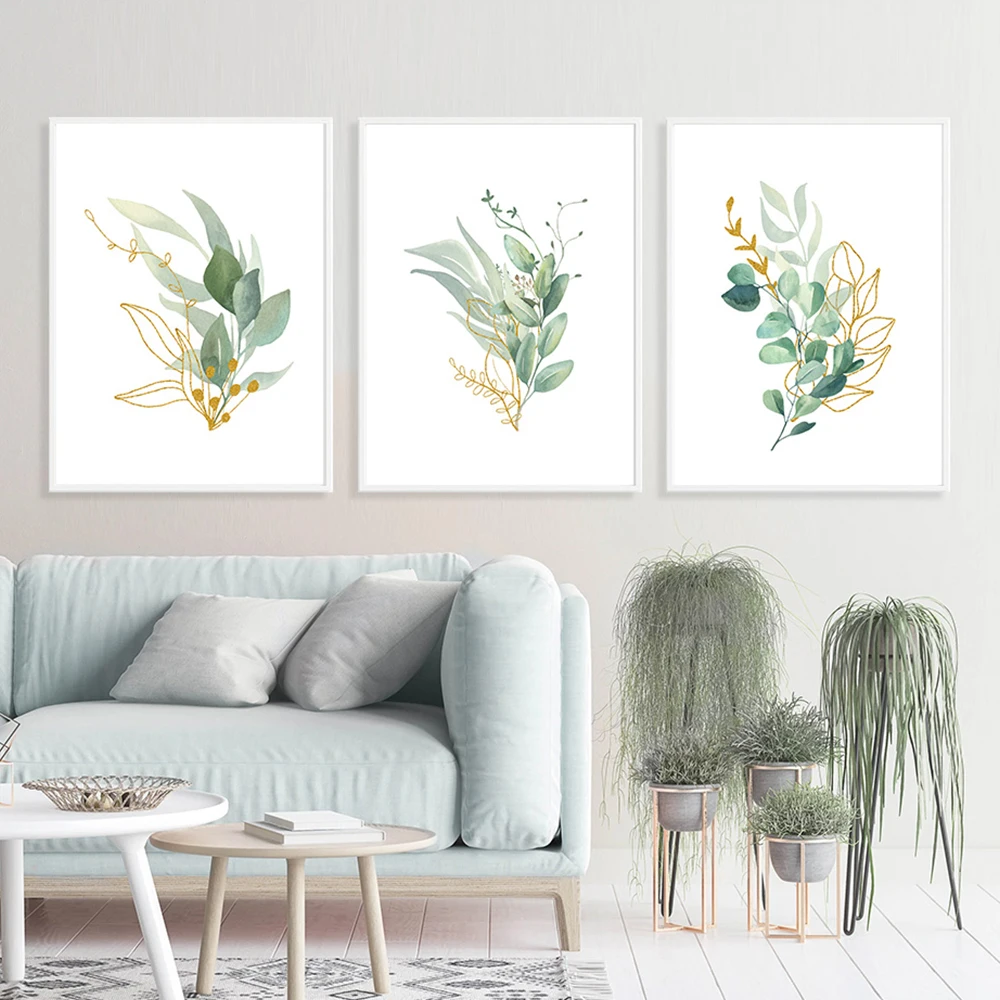 Постеры на холсте с золотыми и зелеными листьями для гостиной