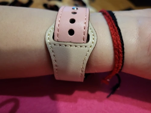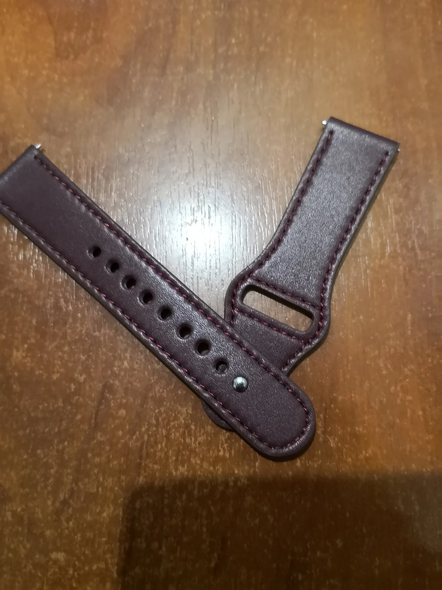 До Питера заказ ехал 16 дней. Ремешок тонкий. Кожзаменитель не плохой. Цвет не коричневый и винный (Спелая вишня). На руке будет смотреться хорошо. А вот кнопка для застегивания не понравилась.... Материал будет растягиваться и ремешок будет скоро растягиваться. Примерно так...