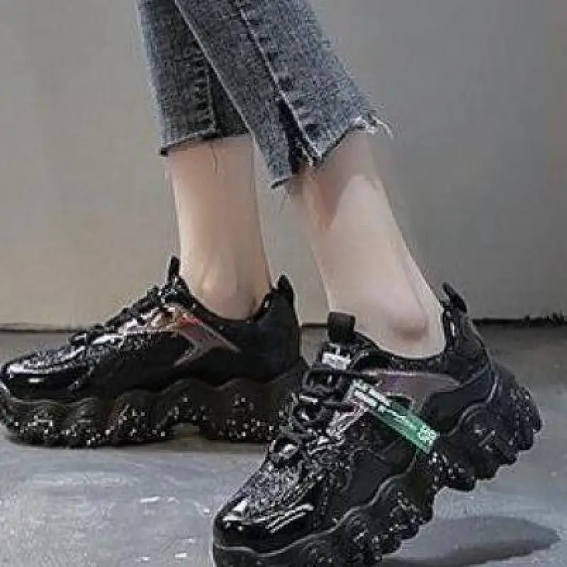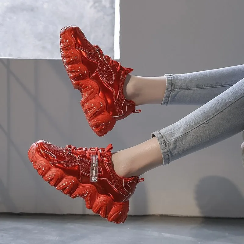 Женские массивные кроссовки размера плюс, обувь для бега на толстой подошве, блестящая Вулканизированная обувь, женские спортивные кроссовки на платформе, черные, красные