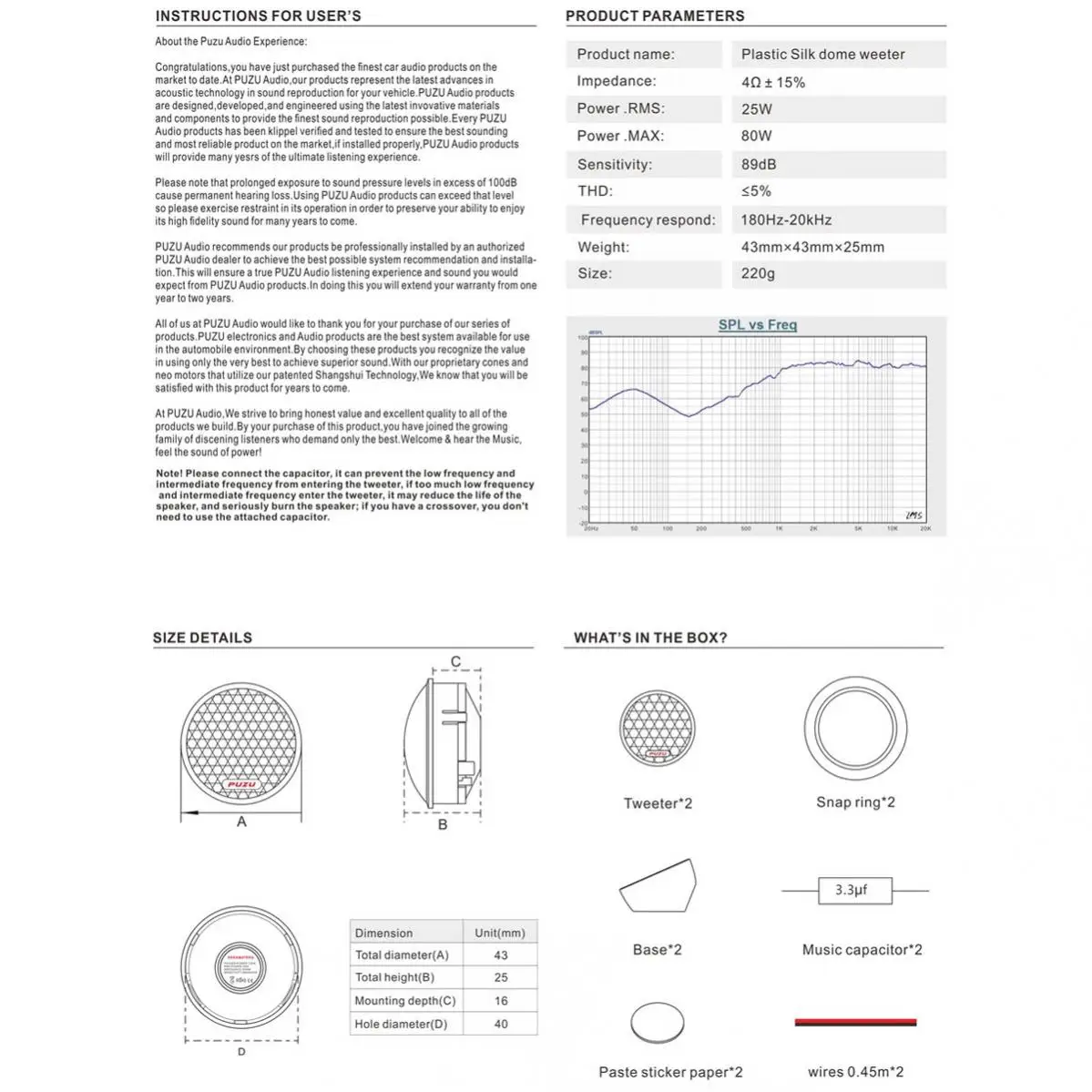 Марка автомобиля: УниверсальнаяОтношение сигнал-шум: 86 дБЧувствительность к звуковым волнам: 89 дБНапряжение: 12 ВТипы динамиков: ТвиттерыЧастотный диапазон (Гц): 230 Гц-20 кГцТип материала: ABSСопротивление: 4ΩВыходная мощность: 120 ВтОсобенности:-Для всех автомобильных аудиосистем.-Встроенный кроссовер.-Подходит для любого места.-Больше звука, меньше энергии.-Нет магнитного поля, ленты и кредитные карты безопасны.-Высокоэффективный купольный твитер.-Мгновенная установка.Примечание:-Перед покупкой, пожалуйста, подтвердите размер установки, убедитесь, что длина и высота панели машины подходят для вашего автомобиля.-Перед установкой, пожалуйста, внимательно проверьте Линии рога автомобиля, Если заземление или столкновение, пожалуйста, повторно подключите линии перед соединением нашей машины, в противном случае это может сжечь машину.-Основная функция твитера заключается в том, чтобы выразить изысканный звук, поэтому расположение установки твитера очень особенное. Если в модификации автомобильного аудио положение установки не является научным, это приведет к тому, что эффект звукового поля не является идеальным.-Твитер должен быть установлен как можно дальше на том же уровне с человеческим ухом, например, на А-столбе автомобиля или над приборной панелью. Некоторые модели расположены на двери, так что звуковое поле в основном находится на одном уровне с человеческим ухом, и владелец автомобиля может лучше испытать очарование, вызванное музыкой.Вес изделия: 140 г/4,94 унцийРазмеры изделия (Д * Ш * В): 50*50*25 мм/1,97*1,97*0,98 дюймовВес посылка: 169,0 г/5,96 унцийРазмеры посылка (Д * Ш * В): 220*145*45 мм/8,66*5,71*1,77 дюймовРозничная упаковка: Да, цветная коробка