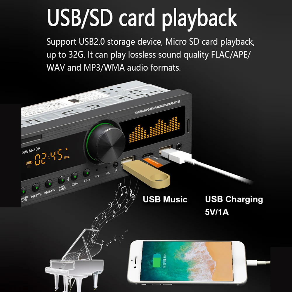 Радио (FM/AM). Чтение карты и USB флэш-накопитель (аудио). Функция AUX. Функция, совместимая с Bluetooth. Аудиовыход RCA может быть подключен к сабвуферу. Подключение к телефону через приложение. Определение местоположения автомобиля. Голосовой помощник (Голосовое управление) (Примечание: просто включите переключатель голосового управления на мобильный телефон через BT. Если мобильный телефон пользователя на английском языке, он поддерживается). Функция копирования источника звука. Яркие огни. Пульт дистанционного управления рулевого колеса (опционально). Характеристики: ТоварНазвание: Автомобильный MP3-плеер Цвет: черный Модель: SWM - 80 - a Напряжение: 12 В Программное решение: SWT6D801 Размер панели: 188x58 мм Светильник панели: яркий светильник Глубина хоста: 60 мм Мобильный Интернет: подключение к мобильному приложению Радио диапазон: FM/AM Радиочип: ZT0811 Мощность: 60 Вт Рабочая температура: -10 ~ 60℃ Версия Bluetooth: 5,0 Чип усилителя мощности: TDA7388 Радиочастота: FM 87,5 ~ 108 МГц/AM 522 ~ 1620 кГц Слот для карт TF: маленькая карта TF Usb-порт и версия: 2 usb-порта; Зарядка по пути и USB2.0 чтение по пути Кнопка сброса: Да Кнопка: Физическая кнопка Введение терминала RCA: 4 выхода RCA (красный/белый разъем) Передний AUX аудио вход: Да Поддерживаемые Аудиоформаты: MP3/WMA/WAV/FLAC Примечание: 1. Возможны незначительные отклонения в размере из-за ручного измерения, различных методов измерения и инструментов. 2. Изображение может не отражать фактический цвет изделия из-за различных фотографирования светильник, угол и дисплей монитора. Упаковочный листПосылка включает в себя: Упаковка 1: 1 х Автомобильный MP3-плеер 1 x Руководство пользователя 2 кабеля питания 1 х Набор ключей для разборки 1 х пульт дистанционного управления 1 х пульт дистанционного управления для рулевого колеса Упаковка 2: 1 х Автомобильный MP3-плеер 1 x Руководство пользователя 2 кабеля питания 1 х Набор ключей для разборки 1 х пульт дистанционного управления