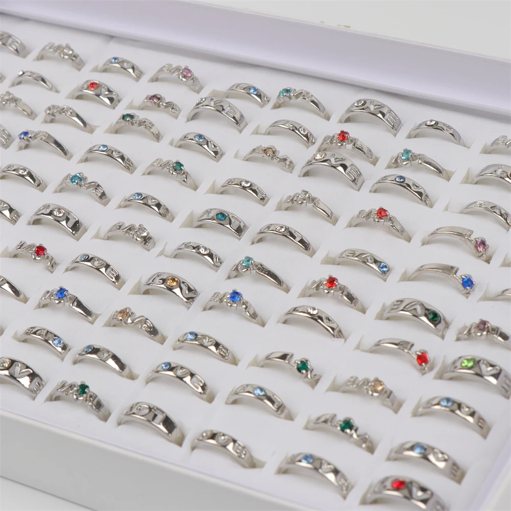 50 шт.лот, модные разноцветные посеребренные кольца с кристаллами для женщин, смешанные стили, свадебные украшения, подарки для вечеринок, оптовая продажа