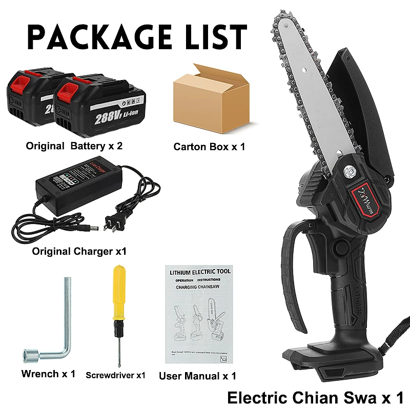 Посылка:Тип A1 Электрическая цепная пила1x аксессуарыАккумулятор-1 шт.1 х адаптер питания (штепсельная Вилка европейского стандарта)1 х РуководствоТип B1 Электрическая цепная пила1x аксессуары2 батарейки1 х адаптер питания (штепсельная Вилка европейского стандарта)1 х РуководствоТип C1 Электрическая цепная пила1x аксессуарыАккумулятор-1 шт.1 х адаптер питания (вилка стандарта США)1 х РуководствоТип D1 Электрическая цепная пила1x аксессуары2 батарейки1 х адаптер питания (вилка стандарта США)1 х РуководствоХарактеристики:-Материал цепи: Высокоуглеродистая сталь-Цвет: серый-Источник питания: литий-ионный аккумулятор-Напряжение: 288 в