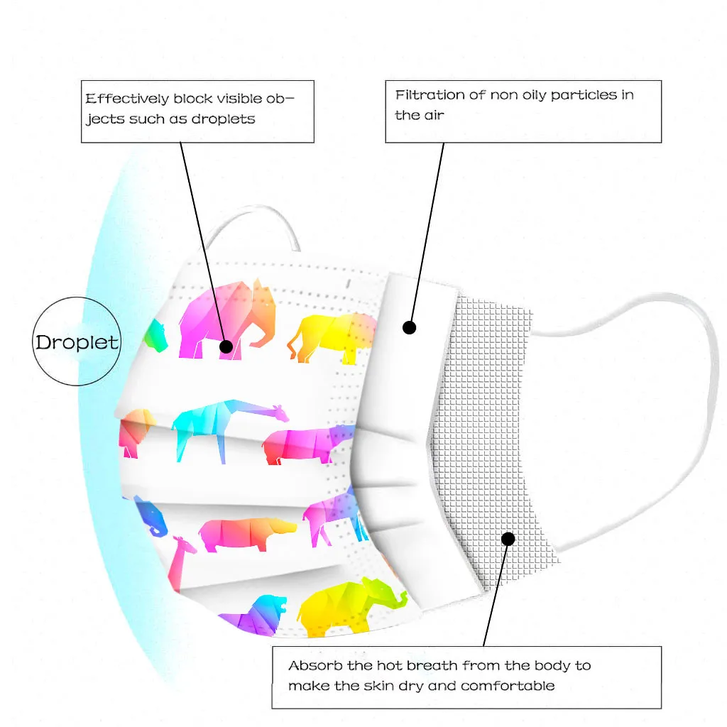В3 слоя Нетканая одноразовая маска изготовлена из 3 слоев нетканого материала,Безопасен и безопасен для использования. Дышащий материал и милыйУзоры, которые делают его полезным и модным. Специальный 3 слоя из нетканого материалаДизайн, обеспечивает некоторую защиту от пыли, автомобильных выхлопных газов,Пыльца и т. д. эластичная Ушная петля, легко носить и не давит на уши.Маникюрный салон или любые другие области, где может потребоваться защита