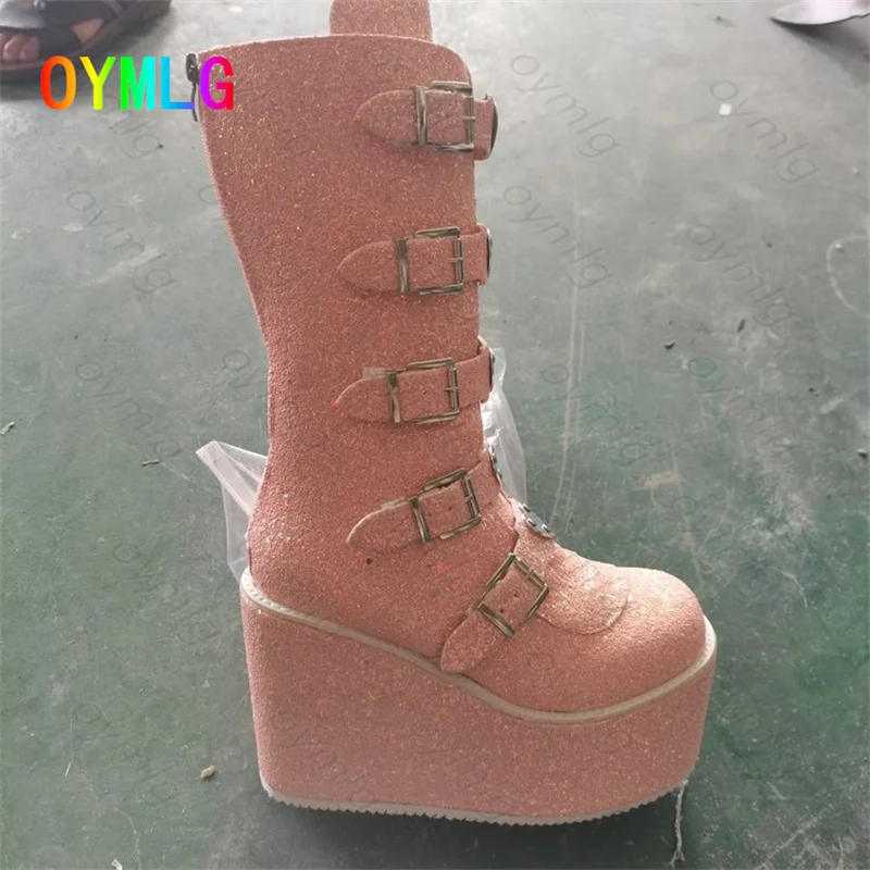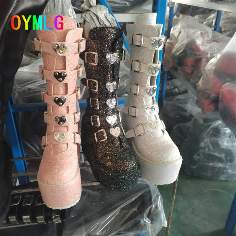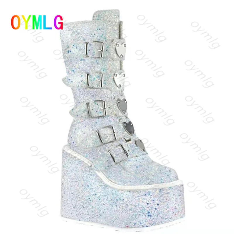 Женские высокие ботинки со шнуровкой, новинка осень-зима 2021, женские ботинки на высокой танкетке с блестками и металлической пряжкой, женская обувь
