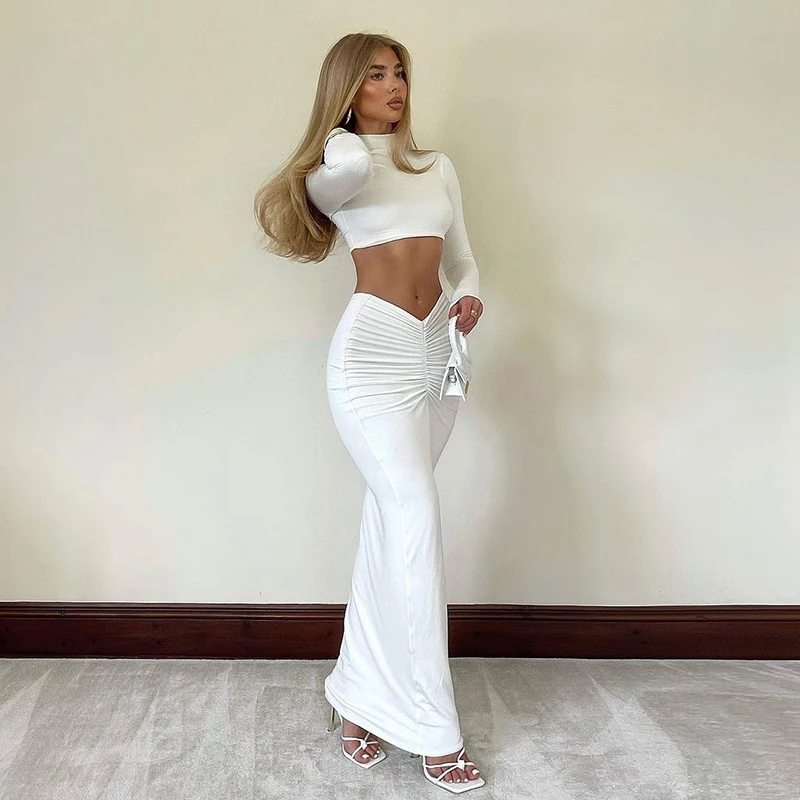 Женский пикантный укороченный топ с длинным рукавом и юбка-макси с рюшами, белый комплект из 2 предметов вечерние вечерняя Клубная одежда, наряды, длинная юбка-карандаш, осень 2021