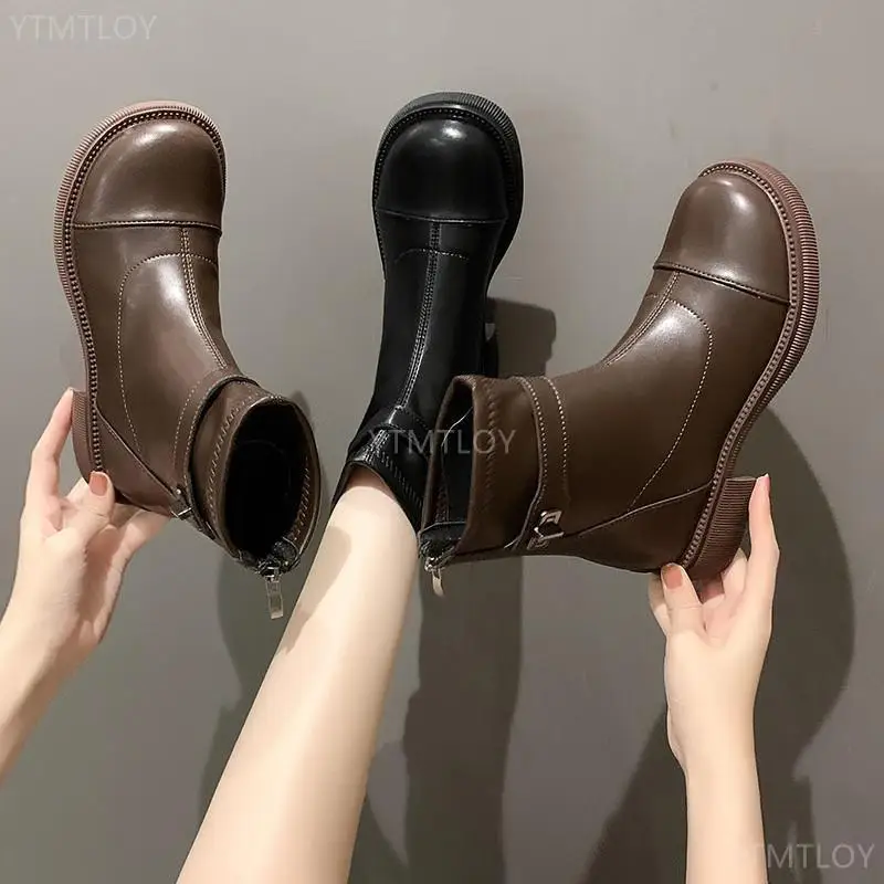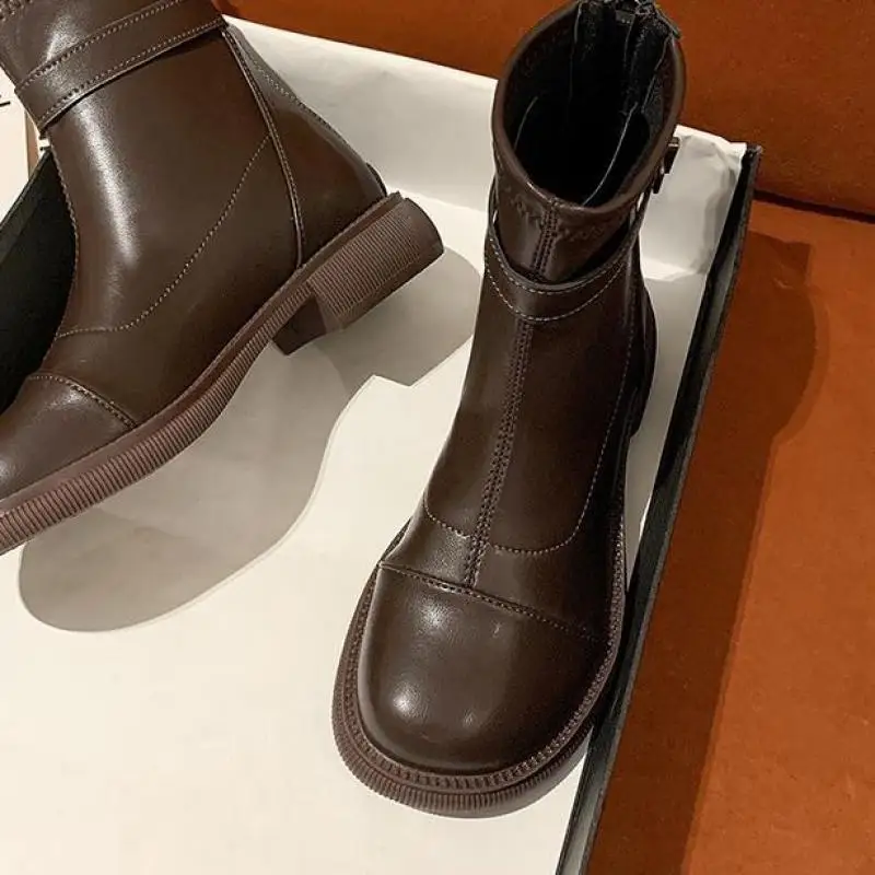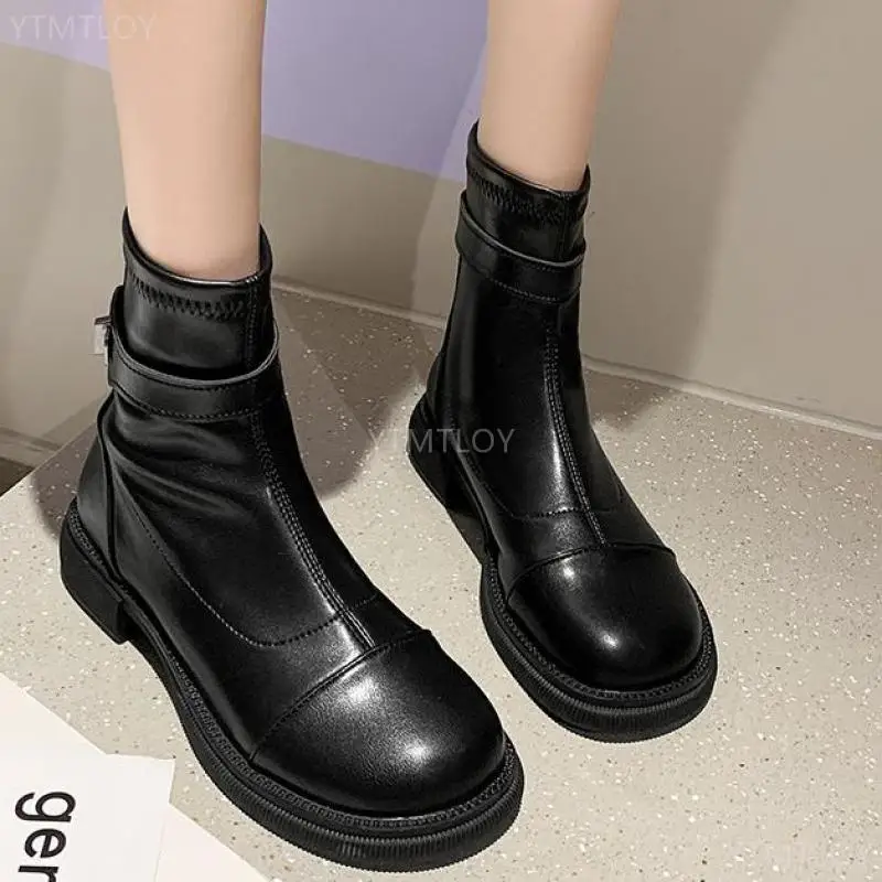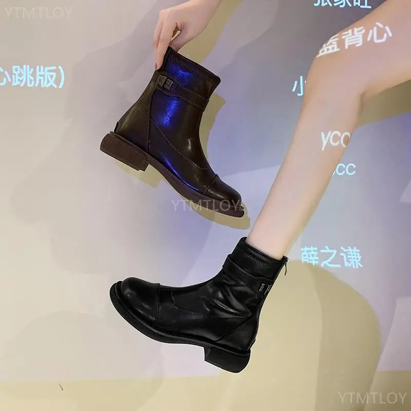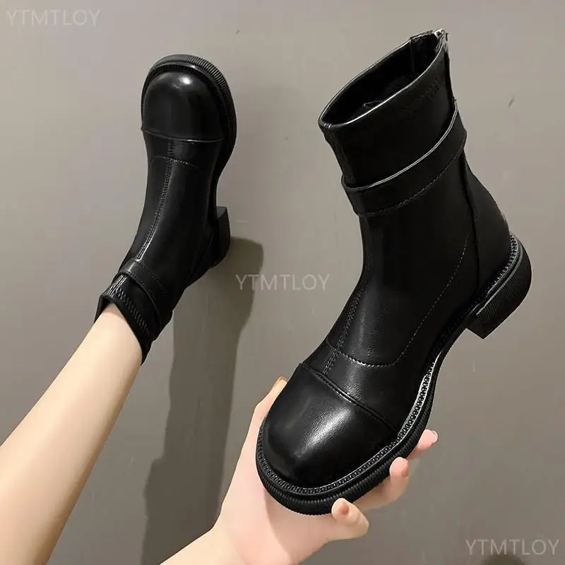 Женские зимние короткие мотоциклетные ботинки с пряжкой и круглым н...