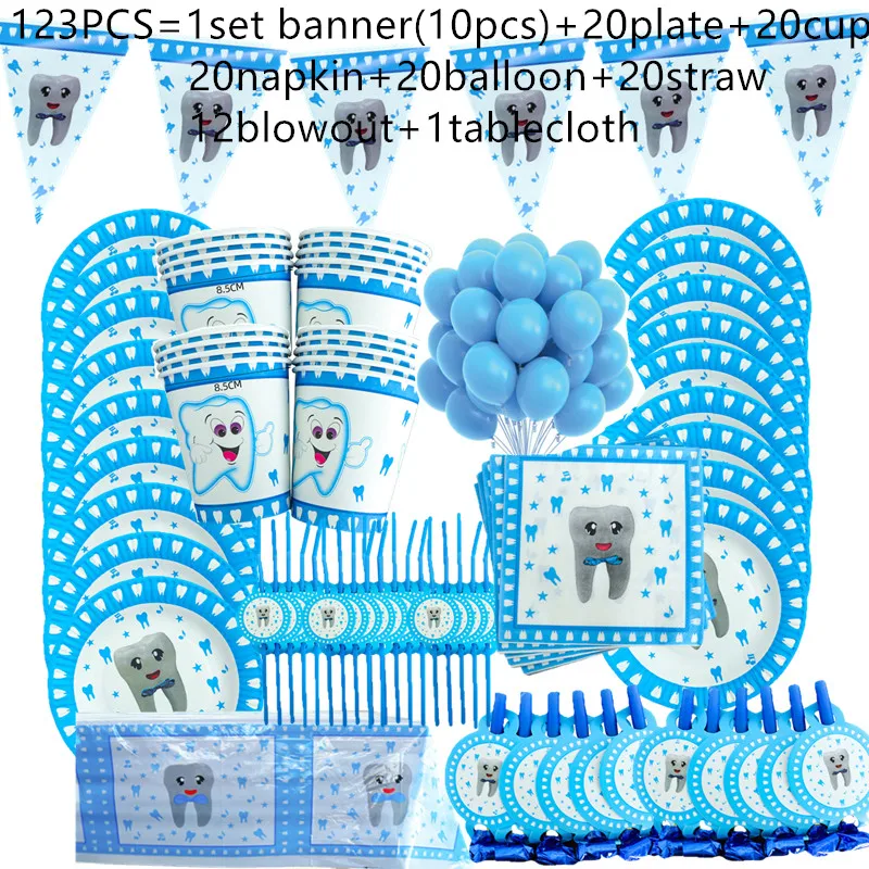 Одноразовая посуда для первого зуба для вечерние, 123 шт., салфетки с рисунком зубов для маленьких мальчиков, бумажные стаканчики и тарелки, праздничные атрибуты, украшения