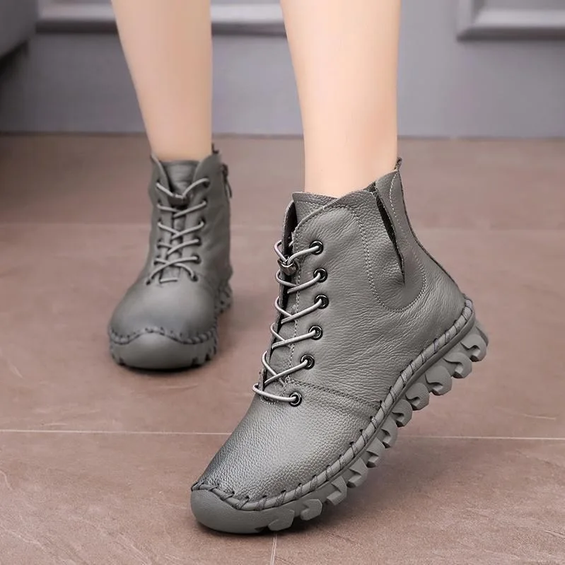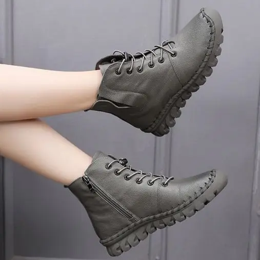 OUKAHUI 2021 осенние однотонные ботильоны из натуральной кожи для женщин на низком каблуке со шнуровкой и круглым носком Нескользящие женские зимние ботинки
