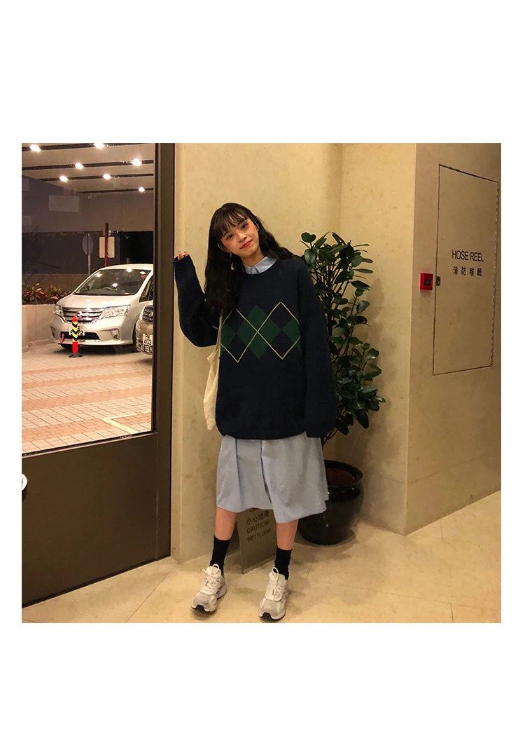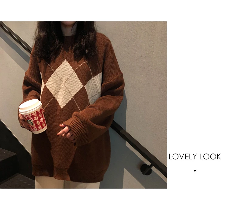 Пуловер женский зимний, свободный, в клетку, с узором ромбиками, 16691
